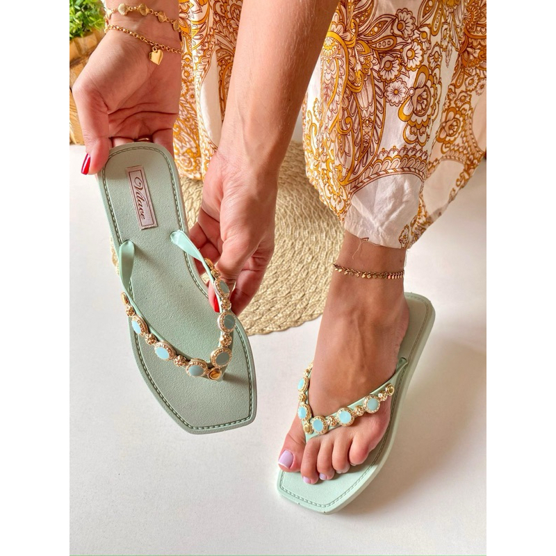 Chinelo Feminino Verão Praia Leve Confortavel Trevo Detalhe Dourado Pedras