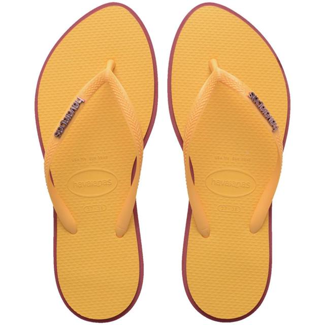 A nova Havaianas Slim Point tem tudo para ser sucesso! O destaque desse chinelo é o bico levemente pontudo, que é a nova tendência, dá todo um diferencial para os pés. Além disso, tem bordas e laterais em cores que contrastam com os tons pastel da sola e das tiras finas com logo metálico, criando um efeito moderno-colorido.