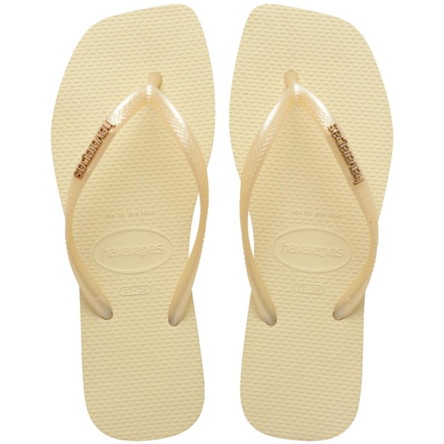 No modelo Havaianas Slim Square Logo Metallic, a sola tem bico quadrado, um estilo novo que deu super certo na Havaianas. Para brilhar, as tiras finas vêm com glitter colorido e o logo da Hava é metálico.