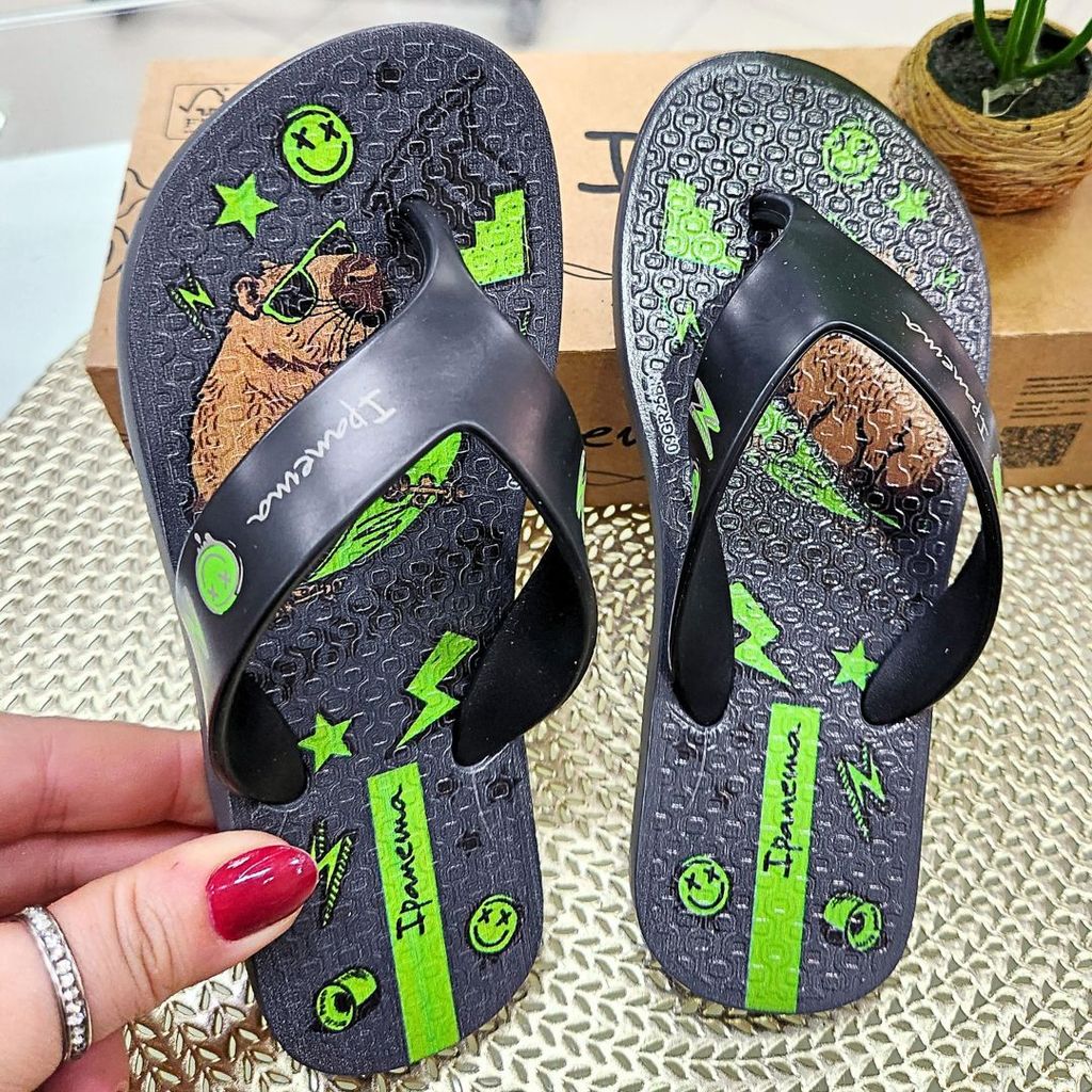 Chinelo Infantil Ipanema Capivara Skatista O chinelo infantil Ipanema com estampa de capivara skatista é ideal para crianças estilosas e cheias de personalidade. Possui design moderno em tons de preto e verde ou cinza e azul marinho, solado confortável e antiderrapante, além de tiras macias que garantem segurança e conforto no dia a dia. Leve e resistente é perfeito para usar em casa, passeios e momentos de lazer. MEDIDAS: 23/24: COMPRIMENTO 16 CM 25/26: COMPRIMENTO 17 CM 27/28: COMPRIMENTO 18,5 CM 29/30: COMPRIMENTO 19,5 CM 31/32: COMPRIMENTO 21 CM 33/34: COMPRIMENTO 22 CM
