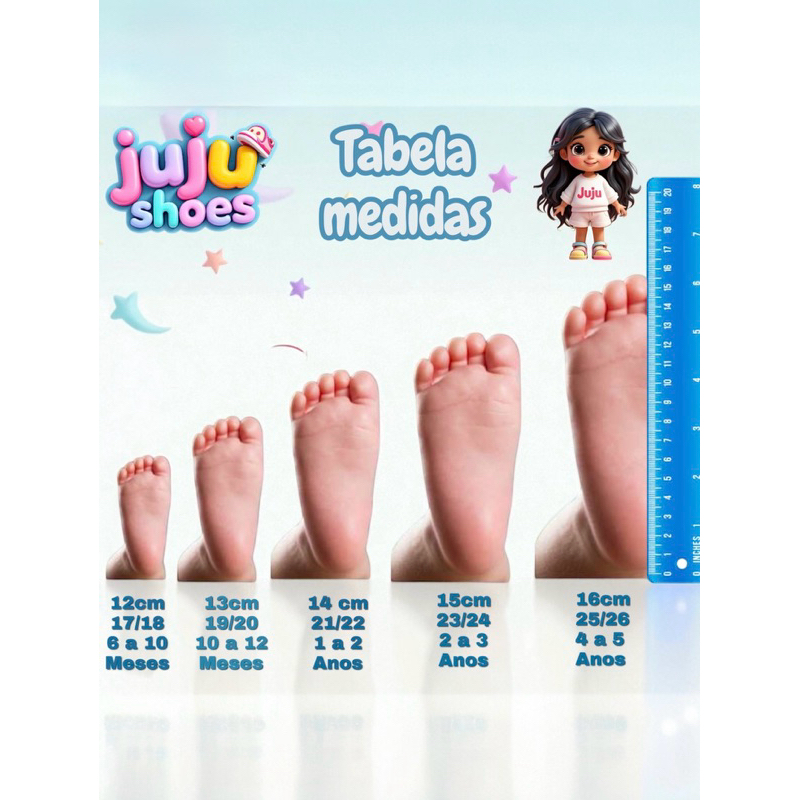 Descubra a magia dos calçados infantis Juju Shoes! Nossa marca se dedica a proporcionar estilo e conforto para os pequenos fashionistas. Cada par é cuidadosamente projetado, garantindo qualidade, durabilidade e cores vibrantes que despertam a imaginação das crianças. Priorizamos a segurança e o conforto com materiais macios e solados flexíveis. Os calçados Juju Shoes são perfeitos para festas, passeios e aventuras no parque, combinando moda e conforto. Junte-se a nós e deixe a imaginação dos seus filhos voar com os sapatos mágicos Juju Shoes! Descrição de tamanho por par 25/26 16cm 27/28 17cm 29/30 18cm 31/32 19cm