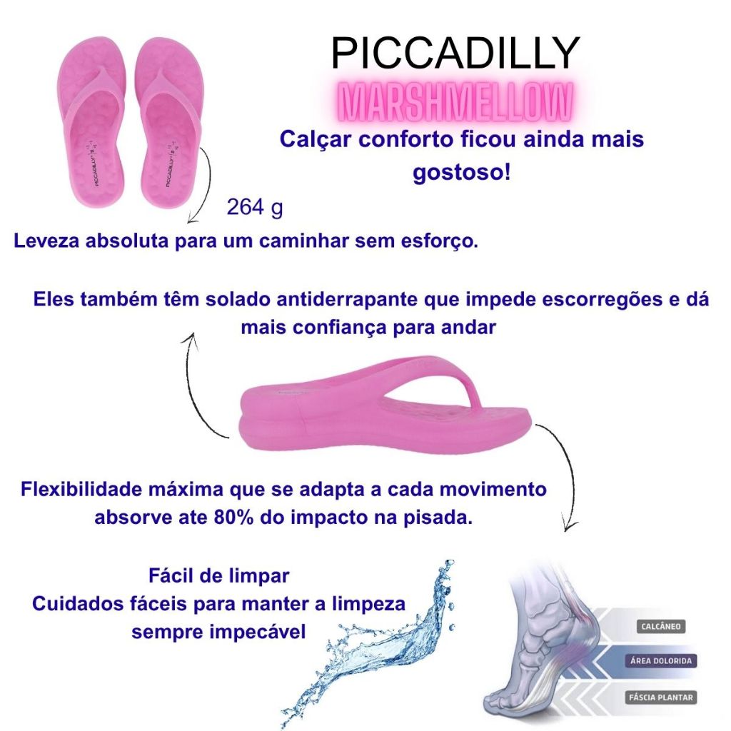 Sua princial função é Absorção de Impacto e Conforto, de tal modo muito indicado para quem sofre de dores nos pés causadas por Esporão, facite plantar, entre outras patologias. Calçar conforto nunca foi tão gostoso. A Sandália Marshmallow é assim como o doce: ultraleve e muito flexível. Perfeito para deixar sua rotina mais descomplicada. Eles podem ser usados dentro ou fora de casa, seja nos momentos de descanso, no home office ou naquelas saidinhas essenciais. É só calçar e pronto: você tem um produto delicioso nos pés. são fáceis de usar e limpar. Basta ter água em temperatura ambiente, detergente neutro e uma escovinha. Outro diferencial é o solado antiderrapante, pensado para que as pessoas não escorreguem e fiquem seguras a cada passo. Os calçados são produzidos em EVA, um material 100% reciclável, que tem maciez e alta durabilidade. Isso reforça o olhar atento da PICCADILLY para o meio ambiente; uma preocupação que vem há muitos anos. Ele vai deixar seu dia a dia mais saboroso. Combine com outras roupas confortáveis como shorts, vestidos, macacões e calças de moletom. Original com Garantia de Fábrica