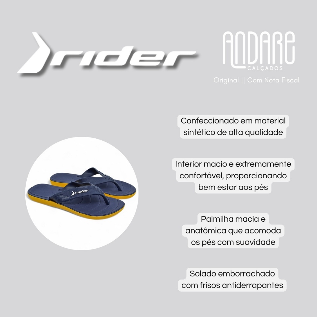 FORMA: Normal (ver tabela de medidas) CABEDAL: Tiras largas em material sintético texturizado, com logo Rider em destaque. PALMILHA: Anatômica, macia e com design que acompanha o formato dos pés, auxiliando na absorção de impactos. FECHAMENTO: Slip on (calce fácil, sem cadarços). SOLADO: Emborrachado com ranhuras estratégicas para melhor aderência e segurança. INTERIOR: Revestimento macio que proporciona conforto no uso diário. ESTILO: Casual, ideal para lazer e dia a dia. ENVIO: Caixa original do fabricante. GARANTIA: 30 dias contra defeitos de fabricação. O Chinelo Rider Masculino Pulse Casual é a escolha perfeita para quem busca praticidade, conforto e estilo no dia a dia. Seu design versátil combina modernidade e funcionalidade, ideal para momentos de lazer, descanso e uso cotidiano. Confeccionado em material sintético de alta qualidade, oferece resistência, durabilidade e leveza, garantindo um uso prolongado sem perder o conforto. O cabedal apresenta tiras largas com acabamento texturizado e aplicação do logo Rider em destaque, transmitindo autenticidade e reforçando a identidade da marca. Seu design moderno proporciona ajuste firme e seguro aos pés. O interior do chinelo é desenvolvido em material macio e agradável ao toque, pensado para oferecer bem-estar constante. A palmilha anatômica acompanha o formato natural dos pés, auxilia na absorção de impactos e proporciona maior sensação de conforto durante o uso prolongado. O modelo possui salto baixo, garantindo estabilidade e praticidade no dia a dia. O solado emborrachado conta com ranhuras estratégicas que aumentam a aderência ao solo, proporcionando segurança contra escorregões e excelente tração em diferentes superfícies. Além disso, sua flexibilidade garante liberdade de movimentos e suavidade a cada pisada. TABELA DE MEDIDAS Tamanho 37/38 - 26,2cm Tamanho 39/40 - 27,2cm Tamanho 41/42 - 28,2cm Tamanho 43/44 - 29,2cm