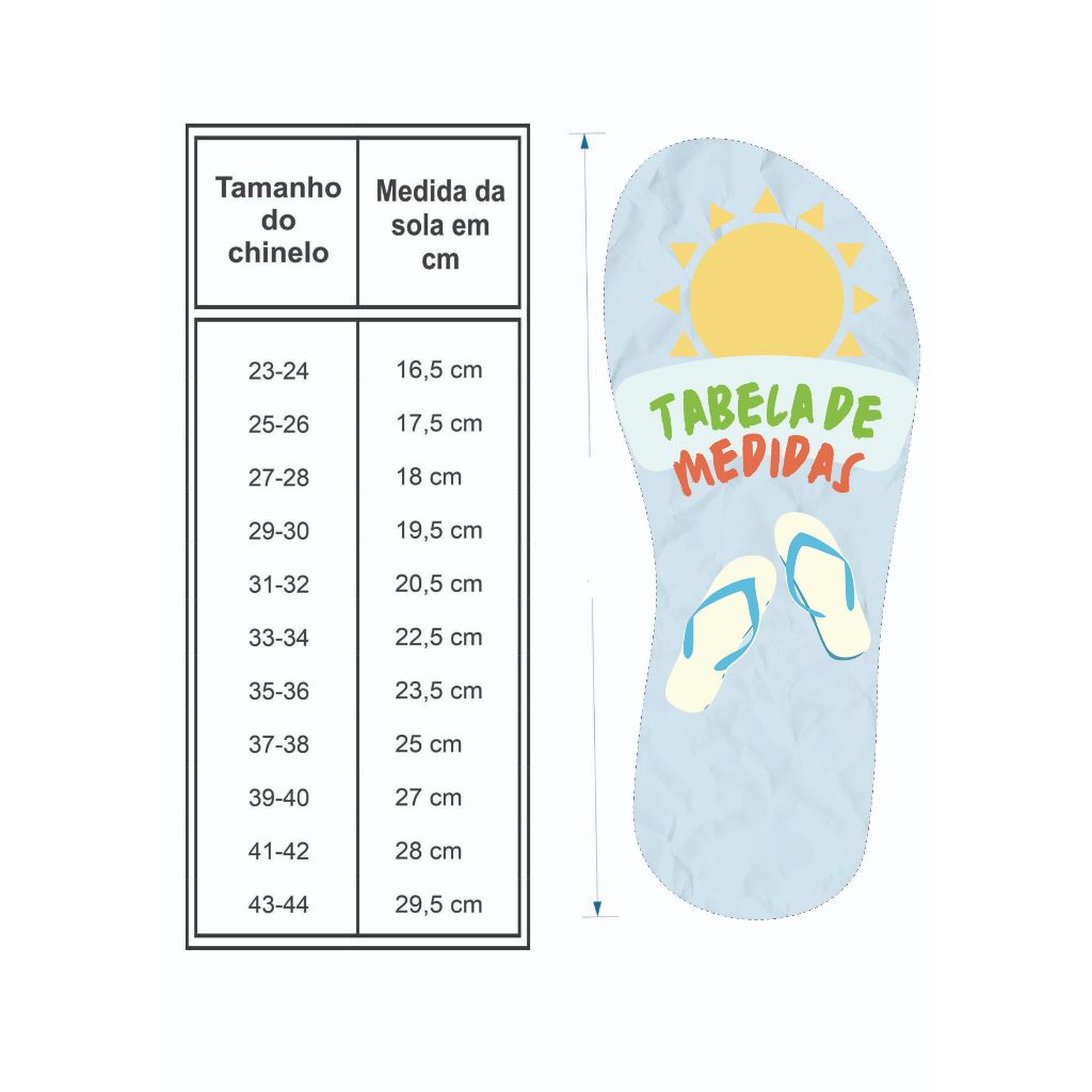 *** Recomendamos escolher um tamanho acima para melhor ajuste *** Nossos chinelos são de primeira linha, com estampas variadas aplicadas com alta tecnologia, acabamento premium, muito confortáveis, com cores vivas e vibrantes. Excelente qualidade, ideais para qualquer ocasião. FOTOS ORIGINAIS DO PRODUTO E EXCLUSIVAS DA NOSSA LOJA! CARACTERÍSTICAS DO PRODUTO: Acabamento: Premium Alça: Primeira Linha Sola: Confortável Estampa: Sublimação de alta durabilidade NUMERAÇÕES DISPONÍVEIS: 23/24 25/26 27/28 29/30 31/32 33/34 35/36 37/38 39/40 41/42 43/44 Enviamos em até 24 horas após a confirmação do pagamento. *** Dúvidas Frequentes *** Durabilidade da estampa: Nossas estampas têm acabamento em poliéster, garantindo fixação resistente e longa durabilidade. Tipo de material: Produzidos em borracha, proporcionando mais conforto para o uso diário. Correias: As correias são fixadas de acordo com a numeração escolhida e estão disponíveis nas cores branca e preta. Caso a cor desejada esteja indisponível, enviaremos a cor em estoque.