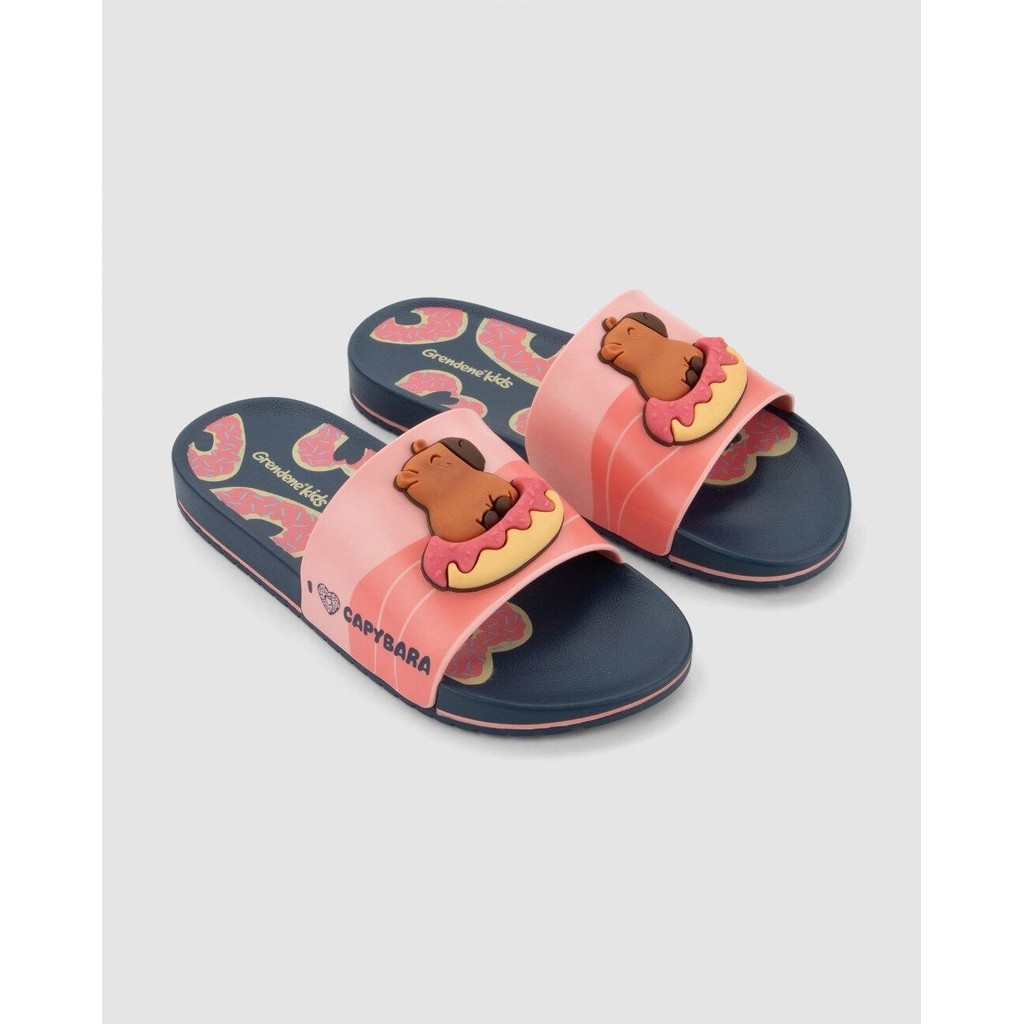 As capivaras estão conquistando corações e ganhando espaço no mundo da moda e do entretenimento infantil, de matérias escolares, pelúcias, roupas e acessórios, as capivaras estão por todos os lados! O Chinelo Slide Infantil Capi Mania Grendene Kids possui um aplique super divertido, onde nossa capivara está em uma destaque em uma boia de donuts, deixando ainda mais lúdico o arquétipo, uma serigrafia em de ondas complementa a cena, para o palmilha, boias de coração preenchem a sola.