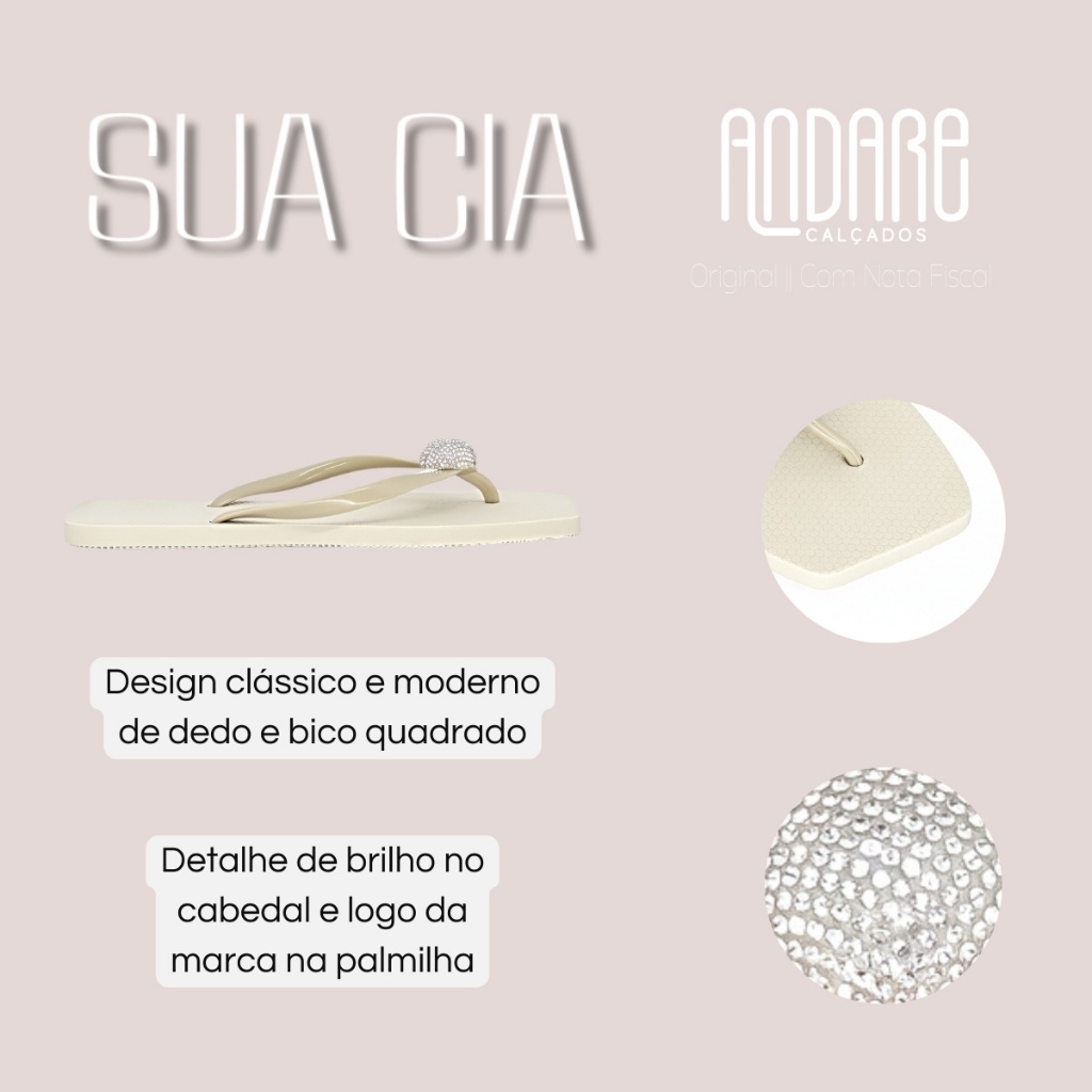 FORMA: Normal (Ver tabela de medidas) CABEDAL: Sintético SOLADO: PVC com frisos antiderrapantes ENVIO: Na caixa do fabricante GARANTIA: Contra defeitos de fabricação - 30 dias O Chinelo de Dedo Sua Cia combina estilo, conforto e qualidade em um único calçado. Desenvolvido para quem busca praticidade no dia a dia sem abrir mão da elegância, esse modelo une um design moderno e sofisticado com características que garantem uma experiência única ao caminhar. Seja para momentos de lazer ou para complementar uma produção casual, este chinelo é a escolha ideal para mulheres que prezam pelo bem-estar e pela moda. Confeccionado em material sintético de alta qualidade, o Chinelo de Dedo Sua Cia destaca-se por sua durabilidade e resistência. Feito em PVC, proporciona vantagens como impermeabilidade, leveza e flexibilidade, tornando-o perfeito para diferentes ocasiões e climas. Além disso, seu material facilita a manutenção e a limpeza, garantindo praticidade para o dia a dia. O design do chinelo alia modernidade e sofisticação. O modelo de dedo clássico é atualizado com um toque contemporâneo, destacando um bico quadrado que adiciona um charme especial ao visual. O detalhe de brilho na tira confere um toque de glamour sutil, tornando o calçado ainda mais elegante e versátil para diversas combinações. Para maximizar o conforto, a palmilha anatômica foi projetada para se adaptar ao formato do pé, garantindo maciez e suavidade ao caminhar. Extremamente leve e confortável, esse chinelo proporciona bem-estar prolongado, ideal para o uso diário. O detalhe da logo da marca na palmilha agrega um toque de exclusividade ao modelo. O solado do chinelo possui uma altura de 1 cm, trazendo um leve suporte sem comprometer a sensação de leveza. Sua estrutura é discreta e funcional, permitindo um caminhar natural e confortável. A segurança ao caminhar é garantida pelos frisos antiderrapantes presentes no solado, que oferecem maior aderência em diferentes superfícies. Essa característica torna o Chinelo de Dedo Sua Cia ainda mais confiável, proporcionando estabilidade e reduzindo o risco de escorregões, mesmo em pisos lisos ou úmidos TABELA DE MEDIDAS Tamanho 33/34 - 22.2cm Tamanho 35/36 - 24cm Tamanho 37/38 - 25.3cm Tamanho 39/40 - 27cm