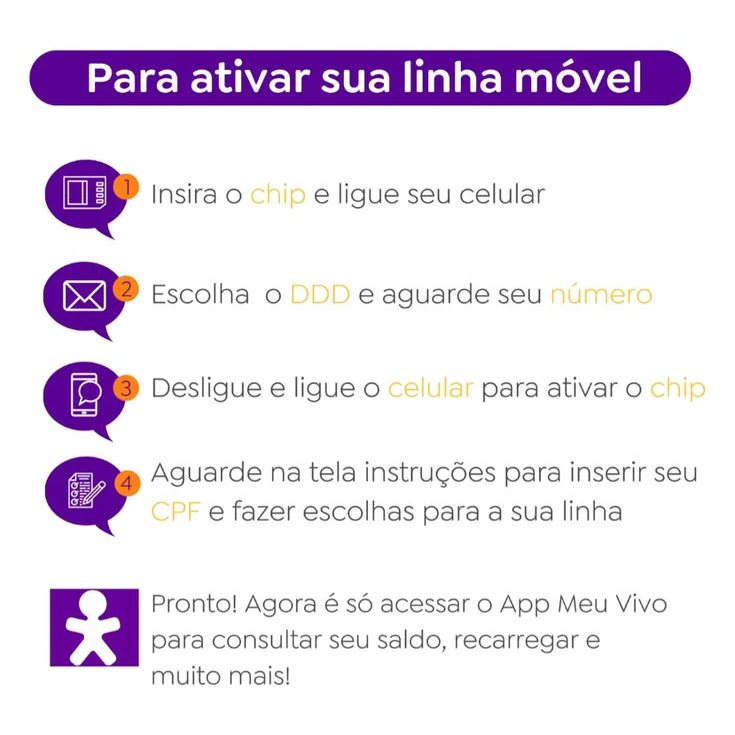 Chip Vivo Pré-Pago 4G e 5G, Chip com 3 cortes (mini, micro e nano). Pronto para uso. Compatível com todos os celulares, ativação rápida em todo o Brasil. Passo a Passo para Ativação (Pré-pago): 1. Inserir o Chip: Desligue o celular e coloque o Vivo Chip (se for dual chip, prefira o slot 1). 2. Iniciar e Escolher DDD: Ligue o aparelho. Uma mensagem na tela pedirá a confirmação do DDD da sua região. 3. Cadastro (via dados móveis): Desligue o Wi-Fi e acesse o site informado por SMS (geralmente cadastro.vivo.com.br) ou aguarde o redirecionamento automático. 4. Documentação: Tenha em mãos CPF e um documento com foto (RG ou CNH) para validação. 5. Confirmação: O sistema enviará um SMS confirmando o cadastro e, em até 2 horas, seu chip estará ativo. Outras Formas de Ativação: Ligação: Ligue para 1058 de qualquer telefone e siga as instruções do atendente. Postagem rapida maximo 24hs. Embalagem: contendo 1 chip vivo com recarga, novo e lacrado. Atenção !!! Verifique com atenção seu endereço de entrega.