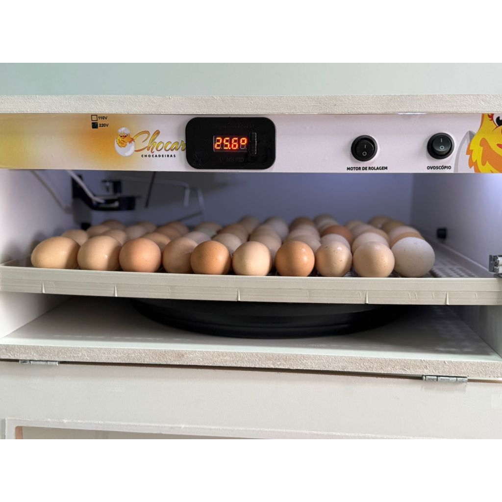 ATENÇÃO. NÃO UTILIZAMOS TERMOSTATO CHINES nosso termostato e nacional Onde sua chocadeira terá uma durabilidade muito longa. ATENÇÃO NOSSAS CHOCADEIRAS NÃO SÃO BIVOLT . Todas as nossas Chocadeiras são programadas, calibradas e testadas de maneira que choca qualquer tipo de ovo, você não precisa se preocupar com a programação. Sua Chocadeira já vai configurada para chocagem de ovos de galinha, se desejar mudar para outra temperatura é só digitar a nova temperatura e confirmar seguindo as orientações que acompanha o produto O PRODUTO EMBALADO ACOMPANHA • Caixa de Madeira MDF com revestimento interno e externo • Ovoscópio embutido para verificação dos ovos (o LED já acompanha na chocadeira) • Porta de Acrilico. Bandeja perfurada com estampo profissional e com dobras ante acidente • Bandeja de Água material PS plástico de alto impacto• Termostato NACIONAL com sistema PID , que controla o tempo de incubação e a rolagem dos ovos a cada 30 MINUTOS • Sensor para medir a temperatura internamente • Resistência Níquel Cromo (Baixo consumo de energia) • Isoladores, Terminais e conector • Ventoinha • Chave Liga/ Desliga do motor de viragem individualmente • Motor de Viragem com retorno automático caso encavale os ovos na rolagem • Polia do Motor e Barra de Arrasto que conecta com a grade • Grade de rolagem dos ovos medidas universal que serve para diversos ovos • Cabo de força • Manual de Instrução Completo .Capacidade 80 Á 90 ovos de galinha de 40 gramas !==========! GARANTIA !========== GARANTIA DO VENDEDOR DE 7 DIAS 90 dias (Oferecemos suporte técnico especializado VITALÍCIO A garantia não cobre peças danificadas por mau uso do produto ou desgaste natural. Caso o cliente necessite de alguma peça de reposição e o produto esteja dentro do prazo de garantia, o cliente pode retirar a peça no escritório da fabrica sem custo algum, ou custodiar o frete para que o item seja enviado.