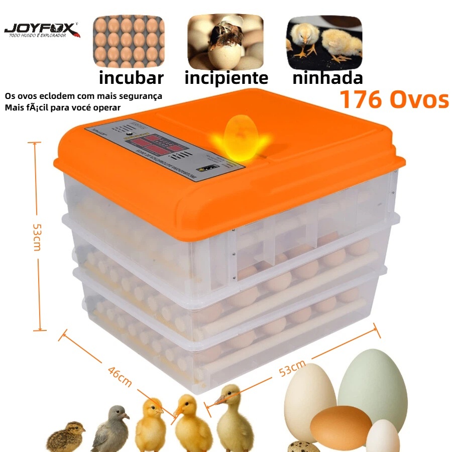 A incubadora automática Joyfox tem capacidade para 1 a 176 ovos. Esta pequena incubadora é uma opção econômica e eficiente para a criação de aves em pequena escala. Possui diversas funções que contribuem para o sucesso da eclosão. Adequada para todos os tipos de ovos. A incubadora digital totalmente automática é adequada para todos os tipos de ovos, como ovos de galinha, pato, ganso, codorna e outras aves ou répteis, atendendo assim às diversas necessidades dos criadores de aves. Viragem automática dos ovos. A incubadora possui um cronômetro regressivo no visor que mostra com precisão o horário da próxima virada dos ovos. Incubação com um clique. Oferecemos cinco modos de incubação para galinhas, patos, gansos, pombos e temperatura constante. Os modos ajustam automaticamente a temperatura de acordo com o dia, sem a necessidade de configurações manuais. O painel LCD simples e intuitivo também inclui um visor de monitoramento de temperatura e umidade com configurações ajustáveis. Sua operação é fácil de entender, prática e simples. Design com rodízios. A distância entre os eixos é ajustável, adaptando-se a diferentes tipos de ovos. Rotação de rolos de 360°, engrenagens independentes e duráveis. Equipada com luz para os ovos. Nossas incubadoras possuem um observador de ovos de alta definição para selecionar ovos fertilizados e monitorar o desenvolvimento embrionário. Eficiência energética e responsabilidade ambiental. Nossas incubadoras são projetadas com tecnologia de economia de energia para minimizar o consumo durante a incubação, contribuindo assim para a proteção ambiental em sua casa. Especificações do produto: Voltagem: 220V (bivolt) Construção: Plástico durável e desmontável, fácil de limpar com um pano úmido Capacidade: 176 ovos Controle de temperatura: Automático/manual Controle de umidade: Automático/manual