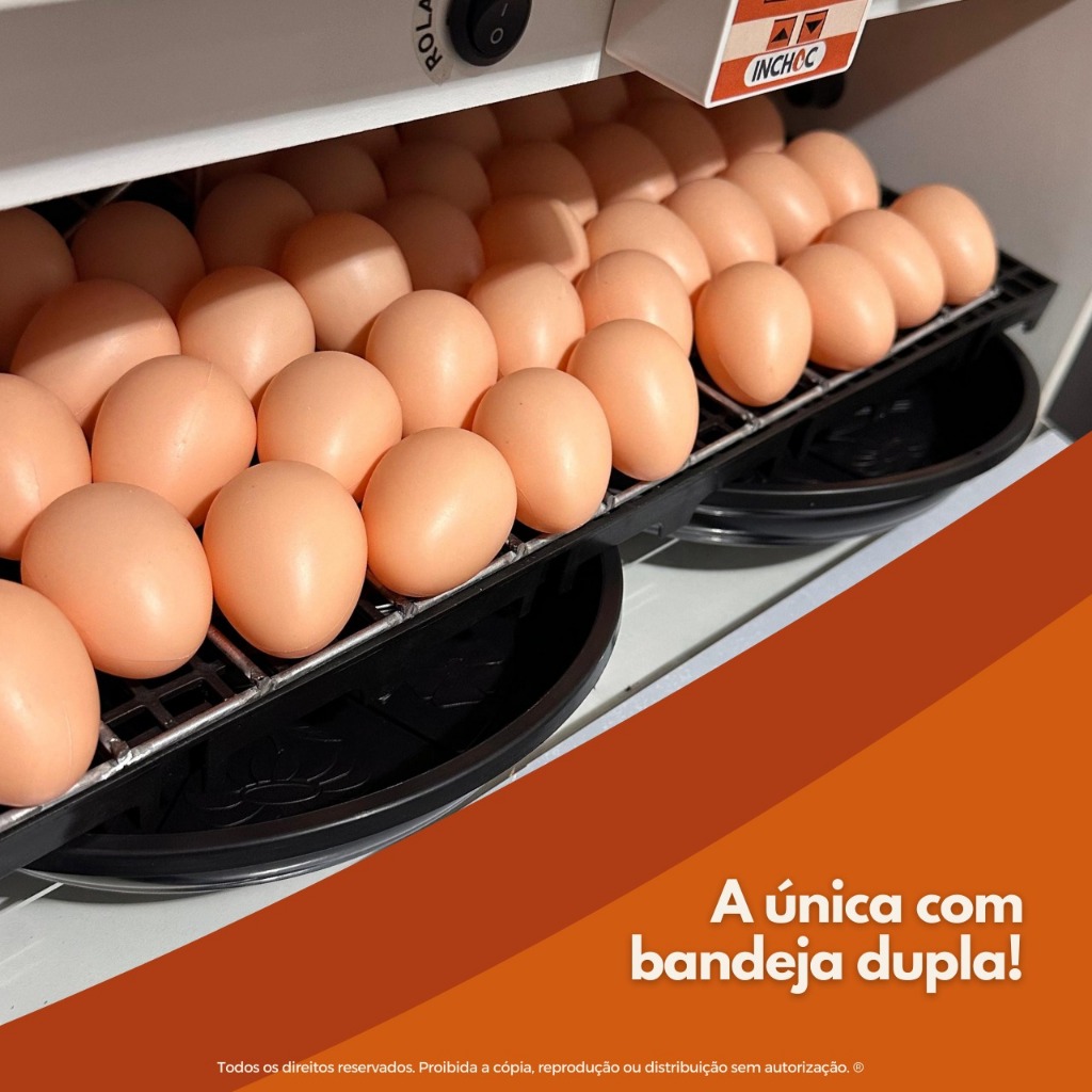 INCHOC LUXO 50 OVOS – Incubadora de Ovos Características: Altura: 27 cm Largura: 54 cm Profundidade: 27 cm Peso: 5kg A Chocadeira Inchoc oferece: * Rolagem dos Ovos Automática * Termostato com sistema integrado liga e desliga * Termostato Configurado de Fábrica * Sistema de ventilação duplo adequado * Bandeja de água (tamanho ideal) * Manual de Usuário * Informativo * Termo garantia * Suporte técnico via WhatsApp Garantia do vendedor 90 dias.