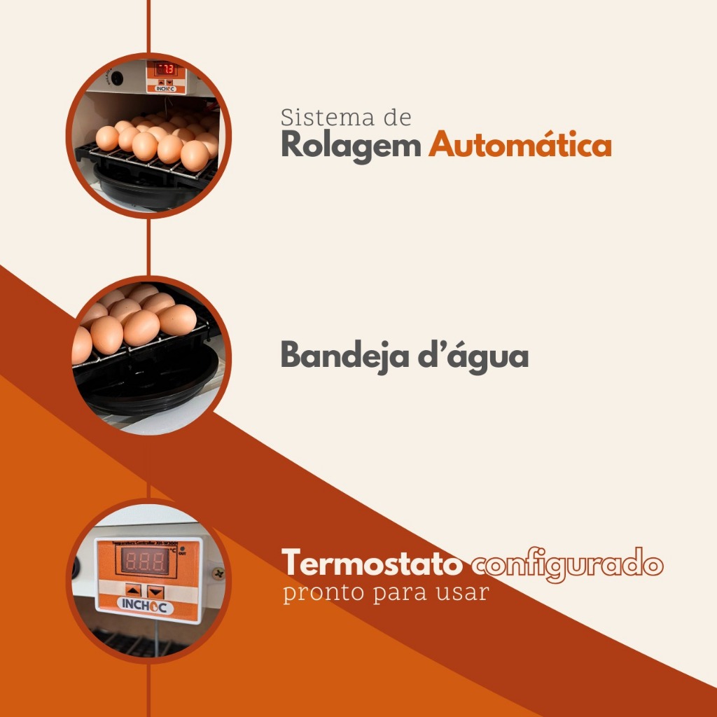 - MODELO SEM OVOSCOPICO ( ensinamos fazer ovoscopia na sua casa) MÈDIA DOS OVOS - 28 ovos Galinha - 60 ovos Codorna - 24 ovos Peru - 30 ovos Faisão - 24 Pata - ETC CARACTERISTICAS: - Altura:28 cm - Largura:29 cm - Profundidade: 33 cm - Peso: 5kg - 130W - Rolagem dos Ovos Automática - Termostato com sistema integrado liga e desliga - Controle de Temperatura Automática - Configurado de Fábrica ( pronto para uso) - Sistema ventilação adequado - Bandeja de água ( tamanho ideal) - Manual de Usuário - Termo garantia.