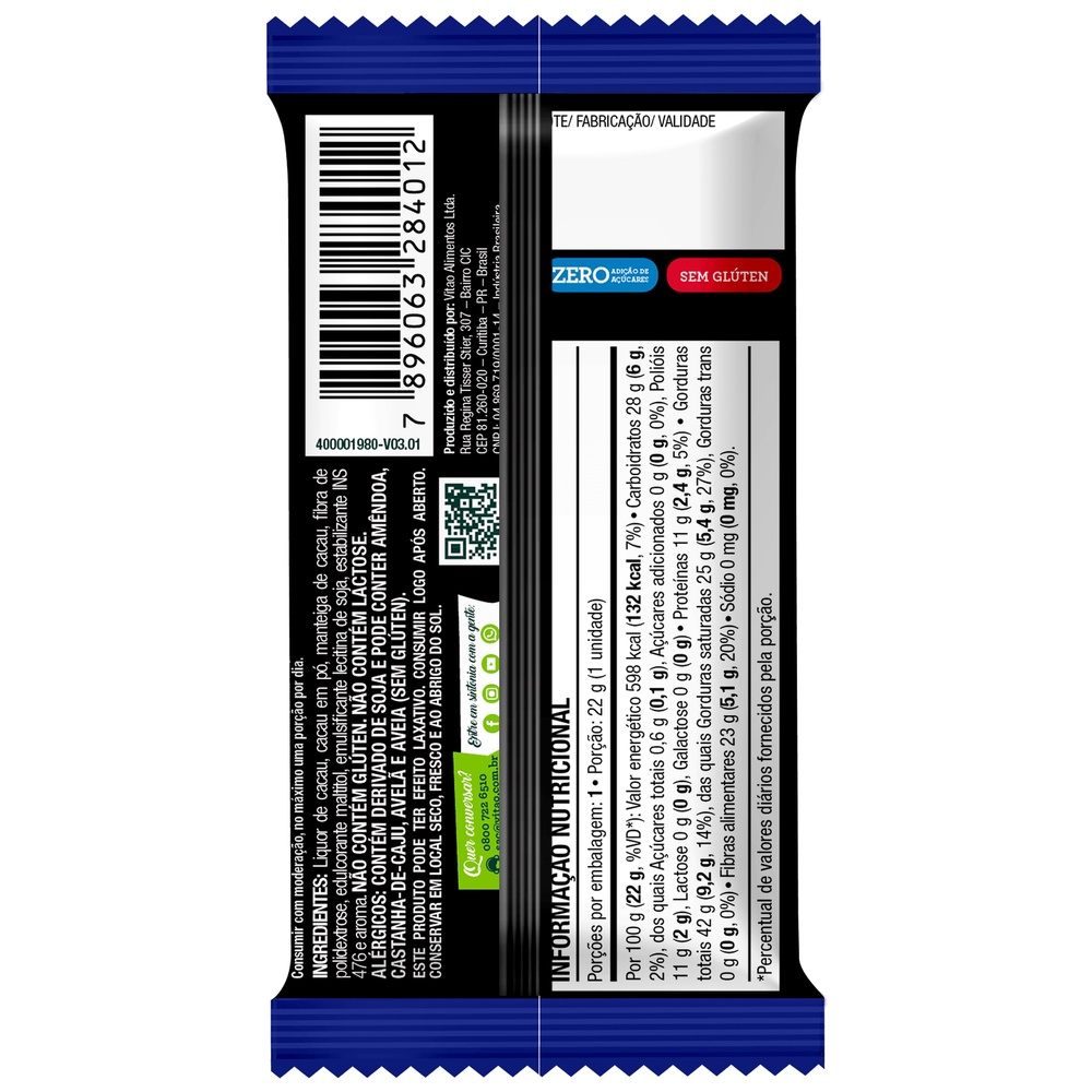 Uma deliciosa combinação de sabor intenso e marcante do chocolate 70% amargo, com a textura macia e irresistível que você já conhece dos chocolates Vitao. A experiência única de sabor é ainda mais especial por ser livre de açúcares adicionados, oferecendo uma opção saudável para quem busca um chocolate cremoso sem comprometer a alimentação equilibrada. Cada pedaço de chocolate derrete suavemente na boca, deixando um sabor profundo e delicioso que vai conquistar os amantes de chocolate amargo. Ideal para quem deseja reduzir o consumo de açúcares, mas não abre mão do prazer de um chocolate de qualidade. INGREDIENTES: Liquor de cacau, cacau em pó, manteiga de cacau, fibra de polidextrose, edulcorante maltitol, emulsificante lecitina de soja, estabilizante INS 476 e aroma. ALÉRGICOS: CONTÉM DERIVADO DE SOJA E PODE CONTER AMÊNDOA, CASTANHA-DE-CAJU, AVELÃ E AVEIA (SEM GLÚTEN). NÃO CONTÉM GLÚTEN. NÃO CONTÉM LACTOSE. SEM GLÚTEN, ZERO ADIÇÃO DE AÇÚCARES, ZERO LACTOSE, VEGANO, FONTE DE FIBRAS.