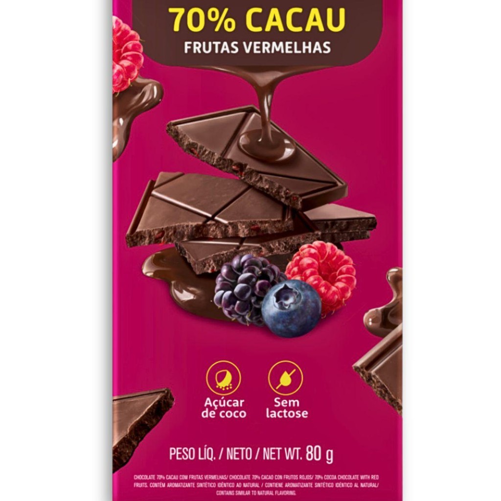 A Barra de Chocolate 70% Cacau Frutas Vermelhas Zero Lactose Fit Food 80g é clean-label, não contém adição de açúcares, é sem lactose e rica em fibras, ela é uma ótima opção para quem não abre mão de comer um bom chocolate mesmo durante a dieta. Não deixe de experimentar também os sabores Cookies n´ Cream e Caramelo Salgado!. Ingredientes:Massa de cacau, manteiga de cacau, açúcar de coco, frutas vermelhas, fibra solúvel, umectante eritritol, emulsificante lecitina de girassol e aromatizante.