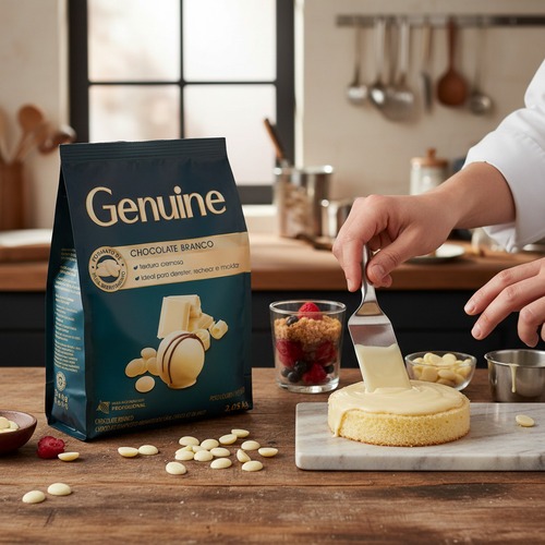 Chocolate Branco Genuine é uma opção perfeita para deixar suas receitas ainda mais deliciosas, somente ingredientes selecionados e importados, promovendo mais sabor e qualidade. O chocolate branco é ideal para utilizar em confeitarias e/ou em suas receitas caseiras. Com fácil manuseio por ser no formato de gotas é bem simples o processo de temperagem para uso. Tabela Nutricional Porção de 25g: Valor Energético: 141kcal=590kj; Carboidratos: 14g; Proteínas: 1,5g; Gorduras Totais: 8,8g; Gorduras saturadas: 5,3g Gorduras trans: 0g; Fibra Alimentar: 0g; Sódio: 32mg. Ingredientes: Açúcar, manteiga de cacau, leite em pó integral, soro de leite em pó, gordura vegetal, gordura de leite desidratada, emulsificantes lecitina de soja e poliglicerol polirricinoleato, aromatizante. NÃO CONTÉM GLÚTEN. ALÉRGICOS: Contém leite e derivados de soja.