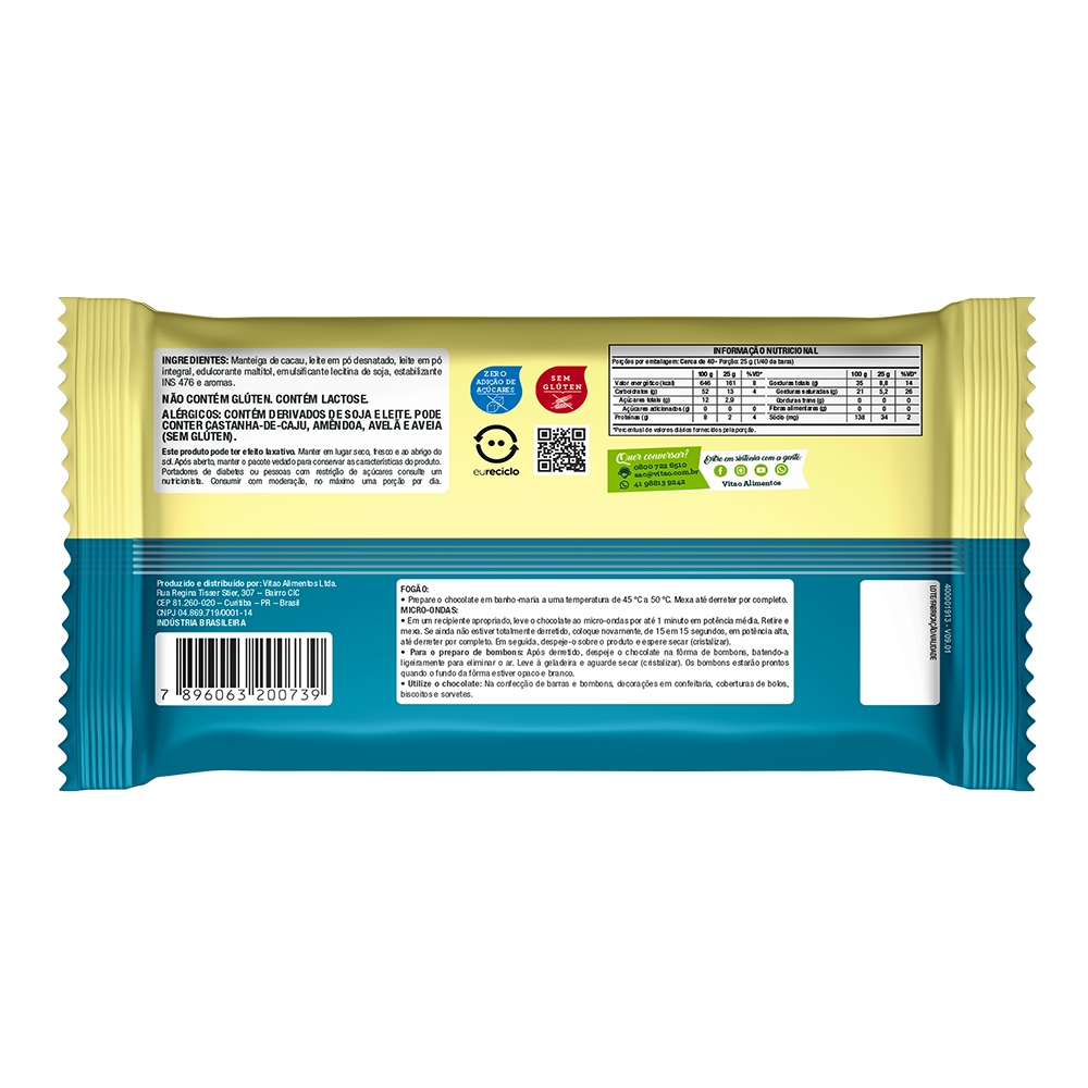 Desfrute da qualidade excepcional do Chocolate Branco Vitao 1,01 Kg. Com um sabor equilibrado e envolvente, este chocolate é cuidadosamente elaborado, proporcionando uma experiência única para os apreciadores de chocolate branco, sem adição de açúcar e sem glúten. Desenvolvido para uso profissional no setor de alimentação, o chocolate da Vitao destaca-se por sua versatilidade, sendo uma adição perfeita em diversas receitas, desde confeitaria até sobremesas gourmet. Sua textura cremosa e sabor inconfundível fazem dele uma escolha premium para elevar o padrão das suas criações culinárias de forma mais saudável. Descubra a excelência do Chocolate Branco Vitao e adicione qualidade gourmet aos seus pratos sem comprometer suas preferências alimentares. MODO DE PREPARO: FOGÃO: • Prepare o chocolate em banho-maria a uma temperatura de 45 ºC a 50 ºC. Mexa até derreter por completo. MICRO-ONDAS: • Em um recipiente apropriado, leve o chocolate ao micro-ondas por até 1 minuto em potência média. Retire e mexa. Se ainda não estiver totalmente derretido, coloque novamente, de 15 em 15 segundos, em potência alta, até derreter por completo. Em seguida, despeje-o sobre o produto e espere secar (cristalizar). • Para o preparo de bombons: Após derretido, despeje o chocolate na fôrma de bombons, batendo-a ligeiramente para eliminar o ar. Leve à geladeira e aguarde secar (cristalizar). Os bombons estarão prontos quando o fundo da fôrma estiver opaco e branco. • Utilize o chocolate: Na confecção de barras e bombons, decorações em confeitaria, coberturas de bolos, biscoitos e sorvetes. INGREDIENTES: Manteiga de cacau, leite em pó desnatado, leite em pó integral, edulcorante maltitol, emulsificante lecitina de soja, estabilizante poliglicerol polirricinoleato e aromas. ALÉRGICOS: CONTÉM LEITE E DERIVADOS DE SOJA. PODE CONTER CASTANHA-DE-CAJU, CASTANHA-DO-PARÁ, AMÊNDOA, AVELÃ E AVEIA (SEM GLÚTEN). NÃO CONTÉM GLÚTEN. CONTÉM LACTOSE. SEM GLÚTEN, ZERO ADIÇÃO DE AÇÚCARES.