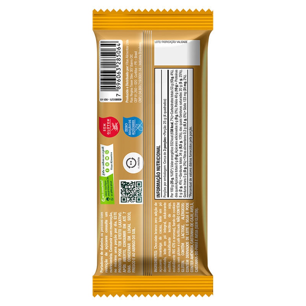 O Chocolate Vitao Marcante Cappuccino combina o sabor intenso do café com a suavidade do chocolate, proporcionando uma indulgência perfeita para os amantes de cappuccino e chocolate. Sem adição de açúcares, oferece uma opção deliciosa sem culpa. Com uma textura cremosa e um sabor marcante que derrete suavemente na boca, este doce é uma experiência sensorial inesquecível. Ele desperta os sentidos e deixa um irresistível gostinho de quero mais. Perfeito para ser saboreado sozinho ou compartilhado, cada quadradinho proporciona momentos únicos. INGREDIENTES: Chocolate branco zero adição de açúcares (manteiga de cacau, leite em pó desnatado, leite em pó integral, edulcorante maltitol, emulsificante lecitina de soja, estabilizante INS 476 e aromas), farelo de cookies cacau sem glúten e café liofilizado. ALÉRGICOS: CONTÉM DERIVADOS DE LEITE E SOJA E PODE CONTER AMÊNDOA, CASTANHA-DE-CAJU, AVELÃ, CASTANHA-DO-PARÁ E AVEIA (SEM GLÚTEN). NÃO CONTÉM GLÚTEN. CONTÉM LACTOSE. SEM GLÚTEN, ZERO ADIÇÃO DE AÇÚCARES.