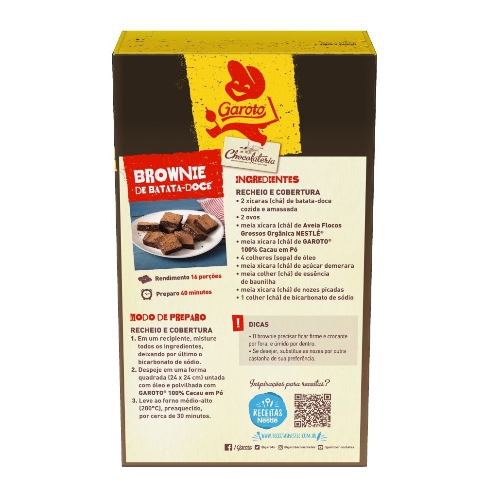 Características do produto: Marca: Garoto Sabor acentuado de cacau puro. Sem adição de açúcar. Não contém Glúten. Porção: Porção 20g = 2 colheres de sopa Modo de Conservação: Após aberta a embalagem, recomenda-se o consumo do produto em até 30 dias. Para melhor conservação mantenha em local limpo, fresco, seco e sem cheiro. Tipo de Embalagem: Caixa Peso Líquido sem Embalagem: 0.2 kg Fornecedor - Garoto