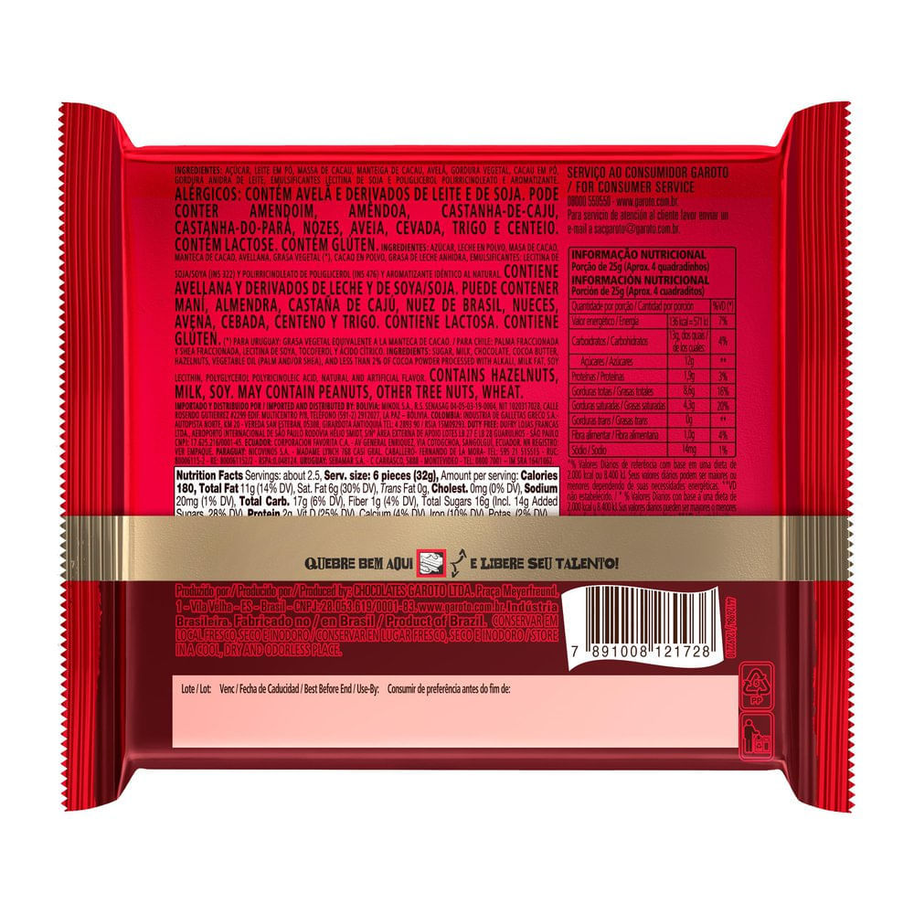 Chocolate Garoto talento ao Leite com Avelãs Pedacinhos de avelã em toda parte do tablete. Hum...Que tal comer muitos Talentos Avelãs só para conferir? É uma boa desculpa, não é mesmo? Ingredientes: A