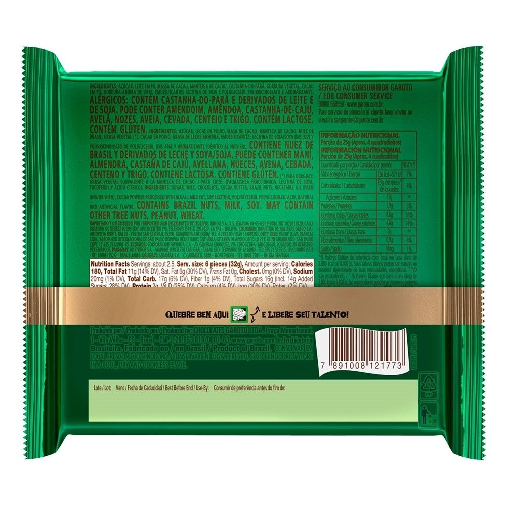 Chocolate Garoto Talento ao Leite com Castanha do Pará 85g - Embalagem com 12 Unidades
