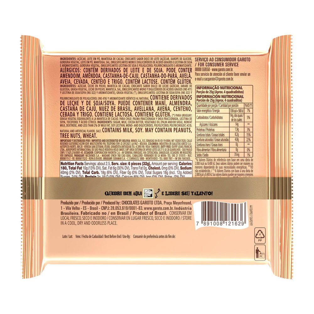 Chocolate Garoto Talento Branco com Doce de Leite Uma combinação perfeita entre o chocolate branco e o delicioso sabor de Doce de Leite. Ingredientes: Açúcar, leite em pó integral, manteiga de cacau,
