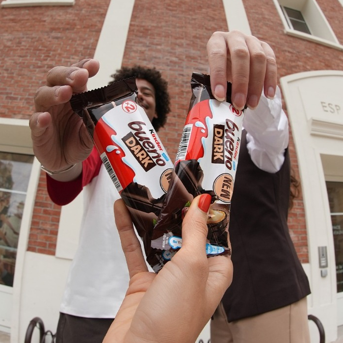 Que tal uma barrinha de wafer coberto com chocolate? Kinder Bueno é um delicioso chocolate com recheio de leite e avelãs e coberto com chocolate meio amargo. Ideal para saborear no dia a dia ou fazer aquela sobremesa de dar água na boca. Camadas Crocantes: A barra Kinder Bueno DARK apresenta camadas finas e crocantes, proporcionando uma textura única que faz cada mordida ser uma experiência memorável. Ingredientes: Chocolate amargo 31,5% (açúcar,massa de cacau, manteiga de cacau, emulsificante lecitinas,aromatizante), açucar, gordura vegetal, farinha de trigo, avelãs (10,5%),leite desnatado em pó, chocolate ao leite(açucar, manteiga de cacau,massa de cacau, leite desanatado em pó, gordura anidra de leite, emulsigicante lecitinas, aromatizante), cacau em pó parcialmente desengordurado,sal, emulsificante lecitinas, fermento quimico bicarbonato de sódio, aromatizante. Total dos componentes do leite:15%. ALÉRGICOS: CONTÉM LEITE, TRIGO, AVELÃS E SOJA. CONTÉM GLÚTEN. Somos uma loja especializada em artigos de festa, confeitaria, embalagens e atacados em doces com lojas físicas no estado de São Paulo, desde 2002.