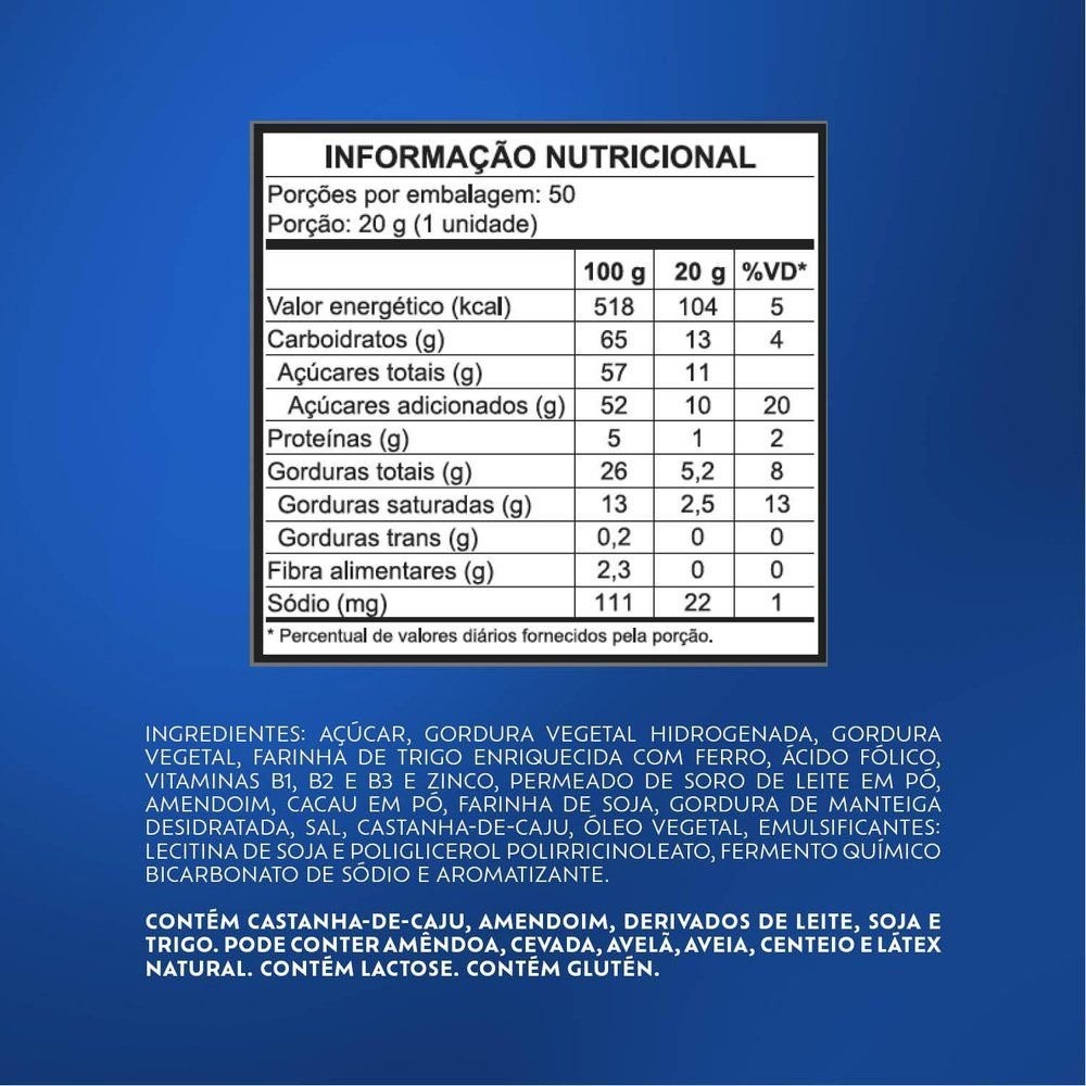 Características Principais do Produto: Marca: Lacta Peso: 1 kg Cobertura: Chocolate Tipo: Wafer Corante Artificial: Não Contém Ingredientes: Açúcar, gordura vegetal hidrogenada, gordura vegetal, farinha de trigo enriquecida com ferro, ácido fólico, vitaminas B1, B2 e B3 e zinco, permeado de soro de leite em pó, amendoim, cacau em pó, farinha de soja, gordura de manteiga desidratada, sal, castanha-de-caju, óleo vegetal, emulsificantes: Lecitina de soja e poliglicerol polirricinoleato, fermento químico bicarbonato de sódio e aromatizante. Fornecedor: Mondelez Brasil Ltda