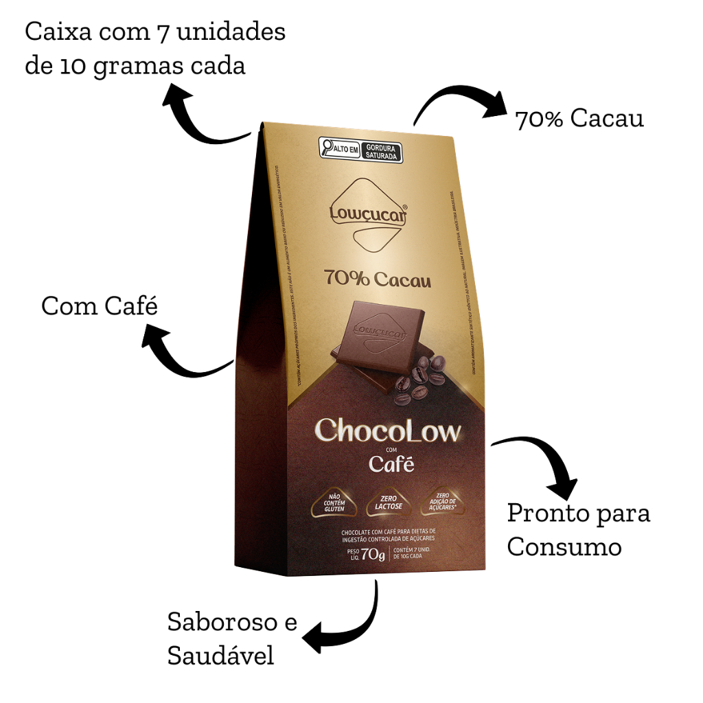 Chocolate Lowçucar 70% Cacau com Café, Chocolow Zero Lactose, Sem Glúten Zero Adição de açúcares 70G