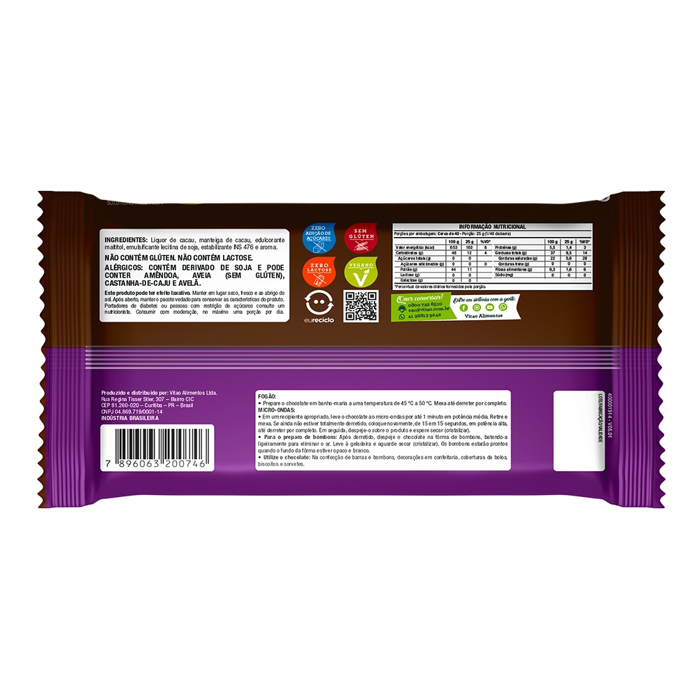 Desfrute da qualidade excepcional do Chocolate ao Leite Vitao 1,01 Kg. Com um sabor equilibrado e envolvente de cacau, este chocolate é cuidadosamente elaborado, proporcionando uma experiência única para os apreciadores de chocolate ao leite, sem adição de açúcar e sem glúten. Desenvolvido para uso profissional no setor de alimentação, o chocolate ao Leite Vitao destaca-se por sua versatilidade, sendo uma adição perfeita em diversas receitas, desde confeitaria até sobremesas gourmet. Sua textura cremosa e sabor inconfundível fazem dele uma escolha premium para elevar o padrão das suas criações culinárias de forma mais saudável. Descubra a excelência do Chocolate ao Leite Vitao e adicione qualidade gourmet aos seus pratos sem comprometer suas preferências alimentares. MODO DE PREPARO: FOGÃO: • Prepare o chocolate em banho-maria a uma temperatura de 45 ºC a 50 ºC. Mexa até derreter por completo. MICRO-ONDAS: • Em um recipiente apropriado, leve o chocolate ao micro-ondas por até 1 minuto em potência média. Retire e mexa. Se ainda não estiver totalmente derretido, coloque novamente, de 15 em 15 segundos, em potência alta, até derreter por completo. Em seguida, despeje-o sobre o produto e espere secar (cristalizar). • Para o preparo de bombons: Após derretido, despeje o chocolate na fôrma de bombons, batendo-a ligeiramente para eliminar o ar. Leve à geladeira e aguarde secar (cristalizar). Os bombons estarão prontos quando o fundo da fôrma estiver opaco e branco. • Utilize o chocolate: Na confecção de barras e bombons, decorações em confeitaria, coberturas de bolos, biscoitos e sorvetes.. INGREDIENTES: Liquor de cacau, manteiga de cacau, edulcorante maltitol, emulsificante lecitina de soja, estabilizante INS 476 e aroma. ALÉRGICOS: CONTÉM DERIVADO DE SOJA E PODE CONTER AMÊNDOA, AVEIA (SEM GLÚTEN), CASTANHA-DE-CAJU E AVELÃ. NÃO CONTÉM GLÚTEN. NÃO CONTÉM LACTOSE. SEM GLÚTEN, ZERO ADIÇÃO DE AÇÚCARES, ZERO LACTOSE, VEGANO.