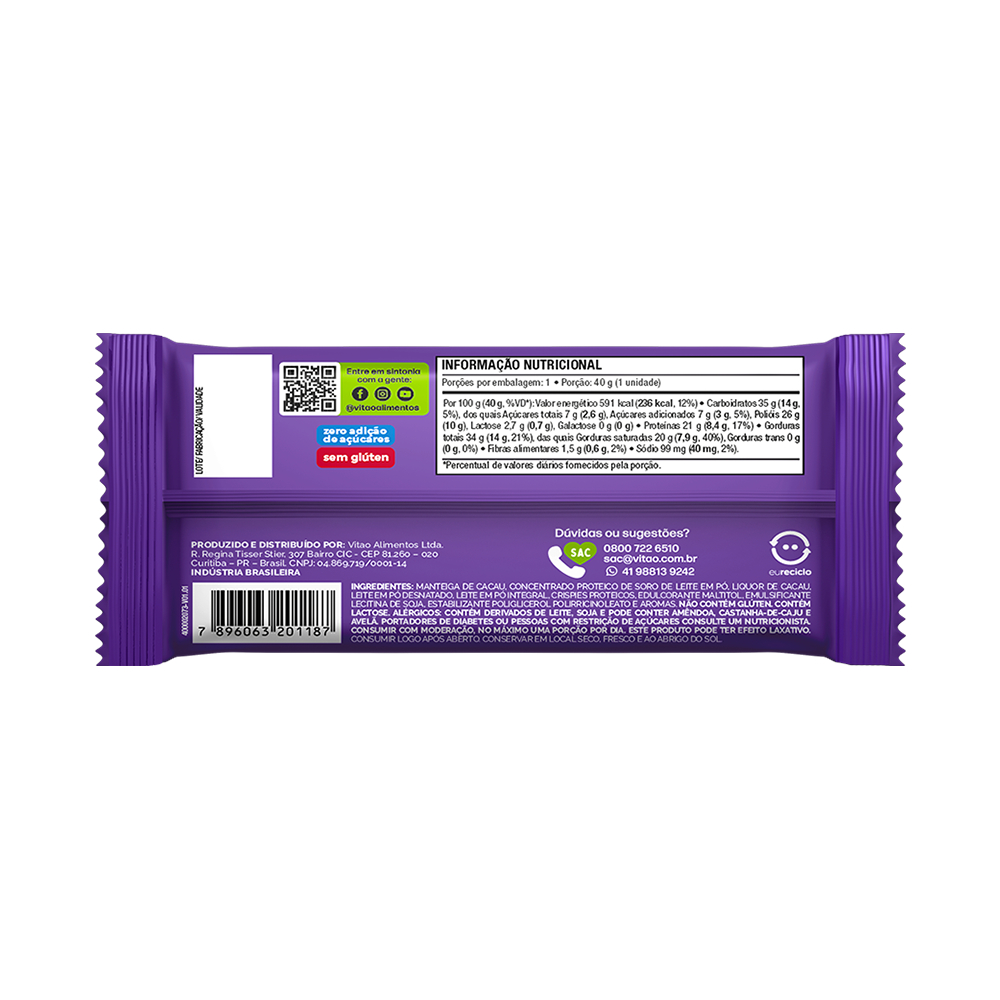 O Chocolate ao Leite SoulPro Proteico Zero Açúcar é uma opção deliciosa e saudável, feito com ingredientes de alta qualidade. Além de proporcionar o sabor irresistível do chocolate ao leite, destaca-se por ser rico em proteínas, oferecendo 8,4g por porção. Essa escolha nutritiva e sem açúcares é perfeita para quem busca um deleite saboroso e ao mesmo tempo saudável. INGREDIENTES: Manteiga de cacau, concentrado proteico de soro de leite em pó, liquor de cacau, leite em pó desnatado, leite em pó integral, crispies proteicos, edulcorante maltitol, emulsificante lecitina de soja, estabilizante poliglicerol polirricinoleato e aromas. ALÉRGICOS: CONTÉM DERIVADOS DE LEITE, SOJA E PODE CONTER AMÊNDOA, CASTANHA-DE-CAJU E AVELÃ. NÃO CONTÉM GLÚTEN. CONTÉM LACTOSE. SEM GLÚTEN, ZERO ADIÇÃO DE AÇÚCARES, PROTEICO.