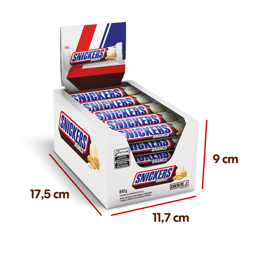 Caixa com 20 unidades do Chocolate Snickers Branco 42g. Snickers Branco 42g é a barra de amendoim, caramelo, nougat e chocolate branco que mata sua fome! Em casa, no trabalho, nos estudos ou na pausa do jogo, Snickers é a barra perfeita para recarregar sua energia. Experimente também os sabores Original, Dark e Pé de Moleque. Ingredientes :Açúcar, amendoim, xarope de glicose, gordura vegetal, manteiga de cacau, leite em pó, sal, clara de ovo em pó, emulsificantes lecitina de soja e poliglicerol polirricinoleato e aromatizante. ALÉRGICOS: CONTÉM AMENDOIM E DERIVADOS DE LEITE, DE SOJA E DE OVO. PODE CONTER TRIGO, CENTEIO, CEVADA, AVEIA E LÁTEX NATURAL. CONTÉM LACTOSE. CONTÉM GLÚTEN.