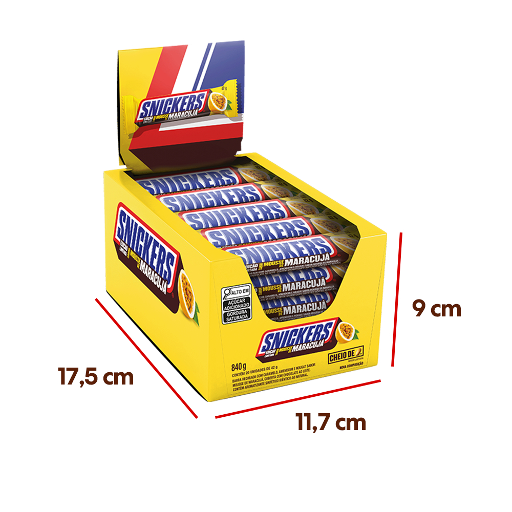 Caixa com 20 unidades do Chocolate Snickers Mousse de Maracujá 42g. Snickers Mousse de Maracujá 42g é a nova versão sabor mousse de maracujá da barra de amendoim, caramelo, nougat e chocolate que mata sua fome! Em casa, no trabalho, nos estudos ou na pausa do jogo, Snickers é a barra perfeita para recarregar sua energia. Experimente também os sabores Original, Dark, Branco e Pé de Moleque. Ingredientes: Açúcar, amendoim, xarope de glicose, leite em pó, manteiga de cacau, gordura de palma, massa de cacau, lactose, gordura láctea, gordura vegetal, sal, clara de ovo em pó, emulsificantes (lecitina de soja e sais de amônio do ácido fosfatídico) e aromatizantes. ALÉRGICOS: CONTÉM AMENDOIM E DERIVADOS DE LEITE, DE SOJA E DE OVO. PODE CONTER TRIGO, CENTEIO, CEVADA, AVEIA E LÁTEX NATURAL. CONTÉM LACTOSE. CONTÉM GLÚTEN.