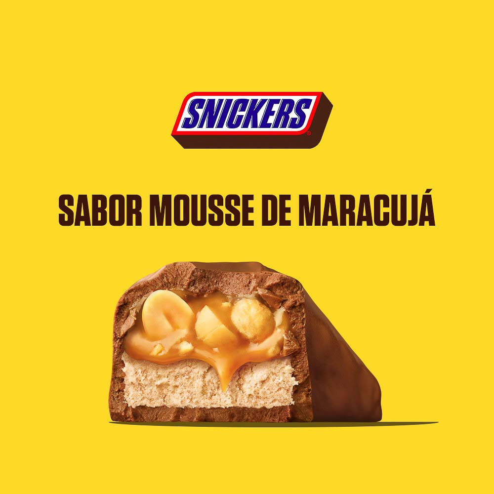 Chocolate Snickers Sabor Mousse de Maracujá Snickers Mousse de Maracujá 42g é a nova versão sabor mousse de maracujá da barra de amendoim, caramelo, nougat e chocolate que mata sua fome! Em casa, no t