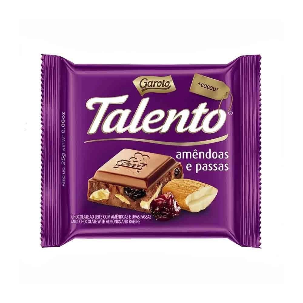 Talento Amêndoas e Passas 25g delicioso, gostoso, saboroso. O que mais podemos dizer do Talento Amêndoas? A combinação de passas e amêndoas é simplesmente maravilhosa. Complicado mesmo é ter que comer um só. Tablete de chocolate ao leite com pedaços de amêndoas e passas, na versão 25g.Ingredientes: Açúcar, leite em pó integral, manteiga de cacau, massa de cacau, amêndoa, uva passa, gordura vegetal, lactose, cacau em pó, gordura de manteiga desidratada, emulsificantes lecitina de soja e poliricinoleato de poliglicerol e aromatizante. contém glúten. alérgicos: contém leite, amêndoa E derivados de leite E de soja. pode conter amendoim, castanha-de-cajú, castanha-do-pará, avelã, nozes, aveia, cevada E trigo.Informação NutricionalPorção 25g (1 tablete)Valor Energético 131kcal (7%)Carboidratos 14g (5%)Açúcares 13g (**)Proteínas 1,8g (2%)Gorduras Totais 7,7g (14%)Gorduras Saturadas 4,3g (20%)Fibra Alimentar 0,9g (4%)Sódio 14mg (1%)Informações de responsabilidade do fabricante.