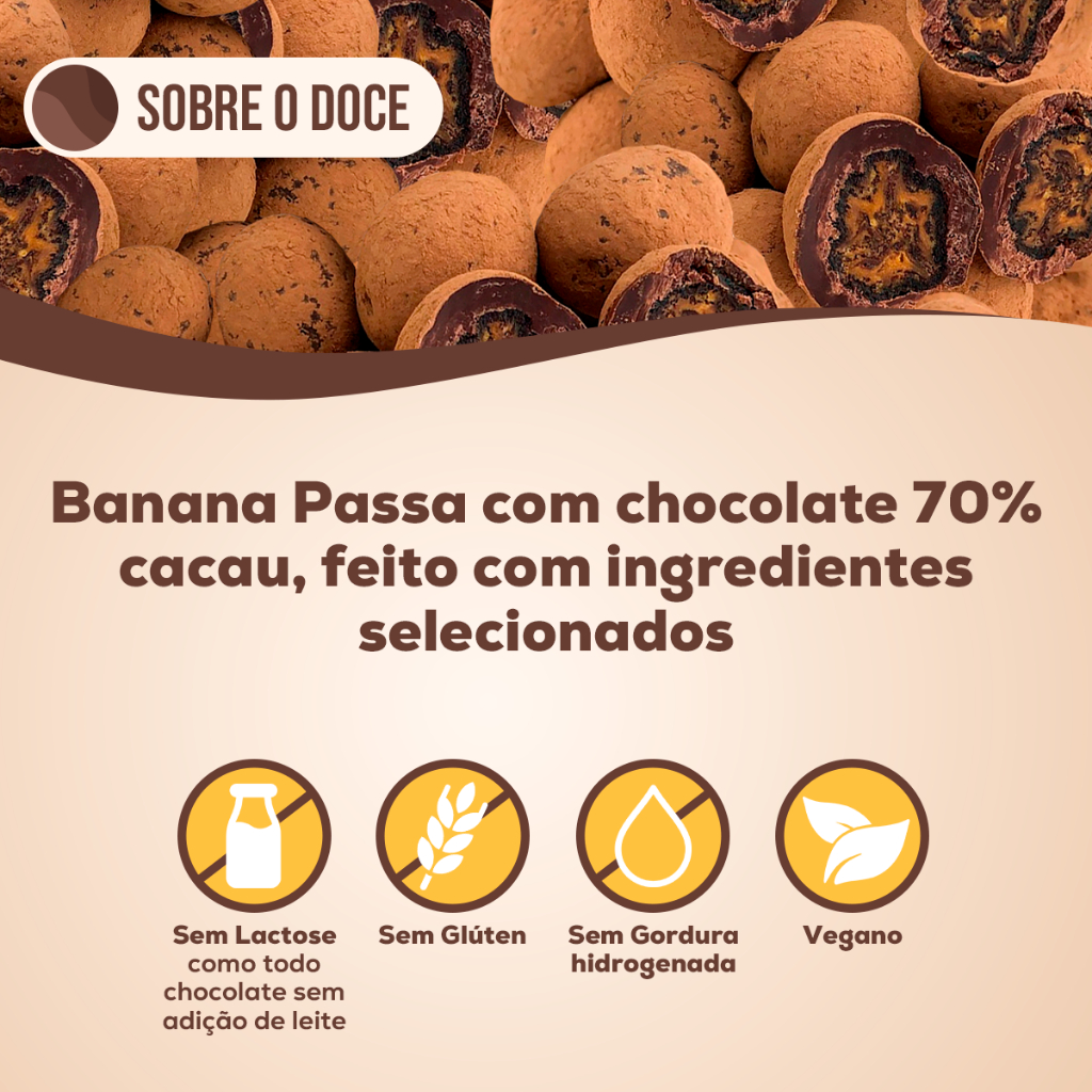 Drageado Banana com Cacau 70% – Sabor e Energia em Cada Mordida O Drageado Banana com Cacau 70% combina a doçura natural da banana com o sabor intenso do cacau puro, proporcionando um snack saboroso e nutritivo. Ideal para quem busca uma opção deliciosa com benefícios do cacau de alta qualidade. ** Benefícios: - Combinação de banana natural com cacau 70% - Rico em antioxidantes do cacau - Sabor equilibrado entre doce e amargo - Prático para consumo como snack - Produto 100% natural ** Ficha Técnica: - Produto: Drageado Banana com Cacau 70% - Ingredientes: Banana desidratada, cobertura de cacau 70% (conforme fabricante) - Indicação: Consumo como snack - Sem Lactose *Imagem ilustrativa. O produto pode apresentar variações de cor, sabor e aparência, conforme as características naturais das matérias-primas e diferenças entre as safras do ano.
