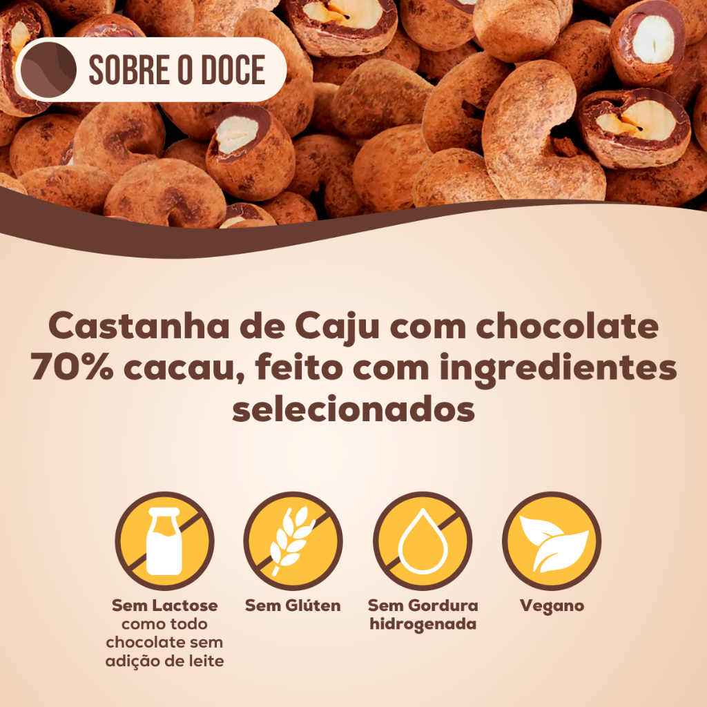 O Drageado Caju com Cacau 70% é uma combinação irresistível de castanha de caju crocante envolta em uma camada de chocolate amargo, proporcionando equilíbrio perfeito entre o sabor intenso do cacau e a suavidade da castanha. Ideal para quem busca um snack sofisticado, nutritivo e delicioso. ** Benefícios: - Castanha de caju crocante coberta com chocolate 70% cacau - Sabor intenso e equilibrado entre doce e amargo - Fonte de antioxidantes naturais do cacau - Rico em gorduras saudáveis e minerais - Ideal para consumo como snack ou sobremesa - Opção prática e sofisticada para o dia a dia ** Ficha Técnica: - Produto: Drageado Caju com Cacau 70% - Ingredientes: Castanha de caju, chocolate 70% cacau e demais ingredientes conforme fabricante - Conservação: Armazenar em local fresco e seco - Validade: Vide embalagem - Sem Lactose *Imagem ilustrativa. O produto pode apresentar variações de cor, sabor e aparência, conforme as características naturais das matérias-primas e diferenças entre as safras do ano.