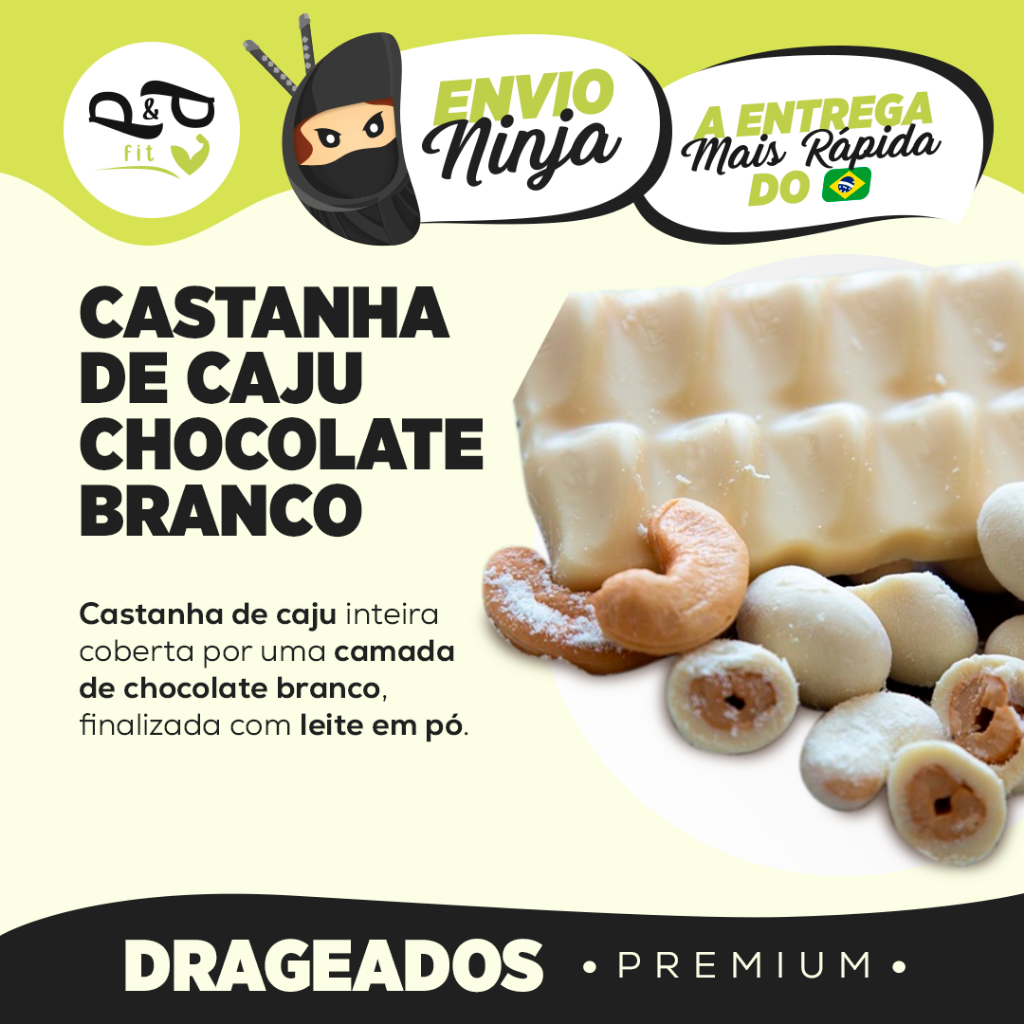 O Drageado Caju Branco é a união perfeita entre a crocância da castanha de caju e a suavidade do chocolate branco, resultando em um snack irresistível e sofisticado. Ideal para quem busca uma opção doce, prática e deliciosa para qualquer momento do dia. ** Benefícios: - Castanha de caju crocante coberta com chocolate branco - Sabor suave e adocicado - Fonte de energia e gorduras saudáveis - Snack prático e delicioso para qualquer ocasião - Ideal como sobremesa ou para presentear - Combinação perfeita de textura e sabor ** Ficha Técnica: - Produto: Drageado Caju Branco - Ingredientes: Castanha de caju, chocolate branco e demais ingredientes conforme fabricante - Conservação: Armazenar em local fresco e seco - Validade: Vide embalagem *Imagem ilustrativa. O produto pode apresentar variações de cor, sabor e aparência, conforme as características naturais das matérias-primas e diferenças entre as safras do ano.