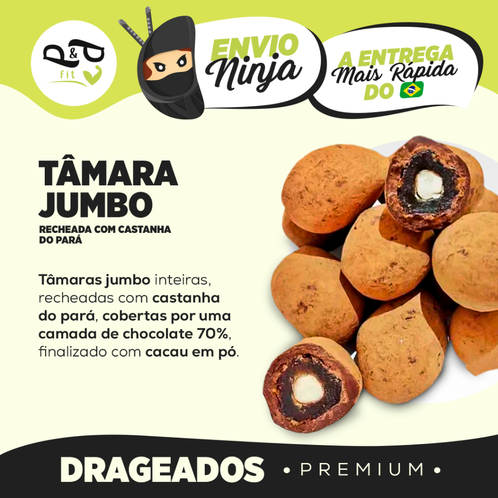 O Drageado Tâmara Jumbo Recheada com Pará 70% é uma combinação irresistível de tâmara jumbo macia recheada com castanha-do-pará e envolta em uma camada de chocolate 70% cacau, proporcionando um snack nutritivo e saboroso para qualquer momento do dia. ** Benefícios: - Combinação de fruta seca com oleaginosa - Chocolate 70% cacau: menos açúcar e mais antioxidantes - Snack saudável e prático - Textura macia e sabor marcante - Ideal para consumo direto ou em lanches ** Ficha Técnica: - Produto: Drageado Tâmara Jumbo Recheada com Pará 70% - Ingredientes: Tâmara jumbo, castanha-do-pará, chocolate 70% cacau - Indicação: Consumo direto como snack - Sem Lactose *Imagem ilustrativa. O produto pode apresentar variações de cor, sabor e aparência, conforme as características naturais das matérias-primas e diferenças entre as safras do ano.