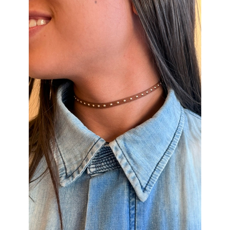 Choker Gargantilha Colar Cordão Courinho Camurça Preto,Nude,Marrom com Tachinhas Vintage Western Country