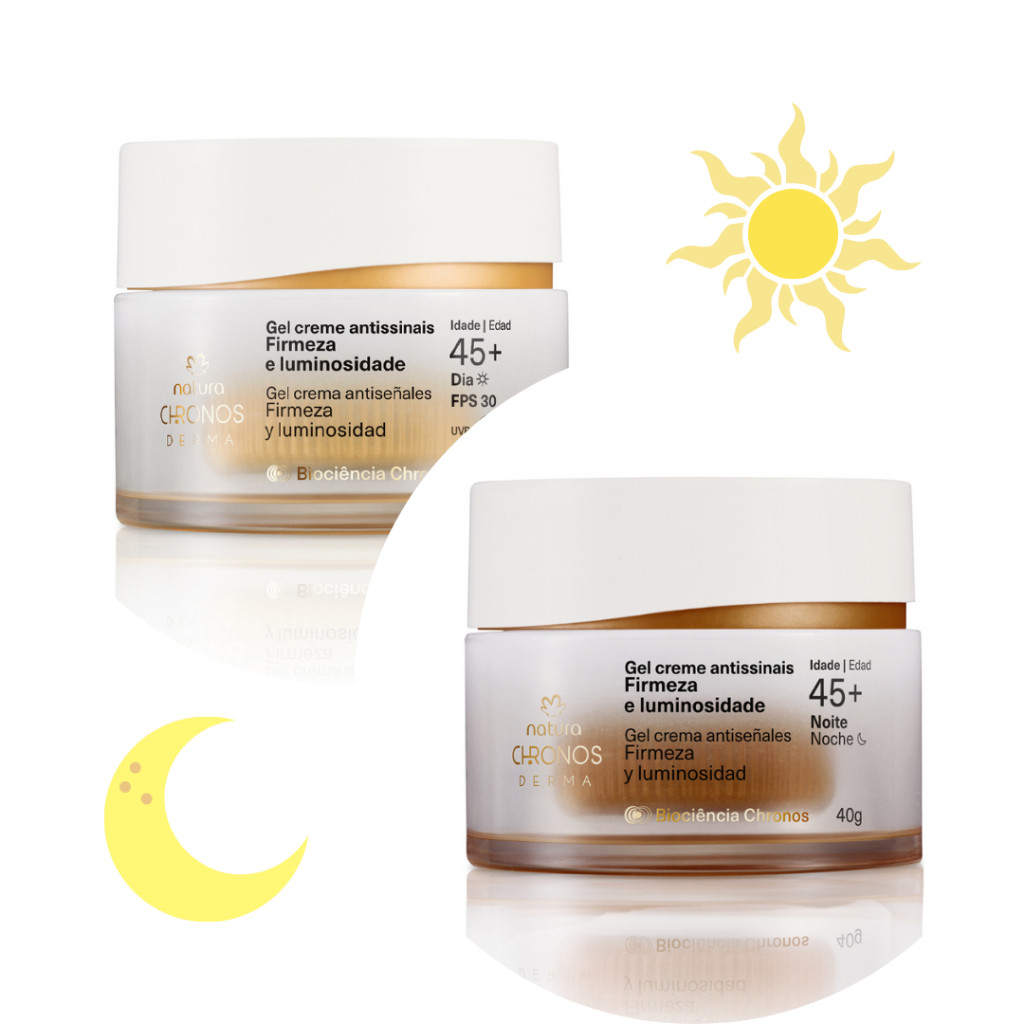 PRODUTO ORIGINAL, NOVO, LACRADO, GARANTIA NATURA, VALIDADE 2027 COMPRAS PAGAS ATÉ AS 11 HORAS DA MANHÃ SERÃO ENVIADAS NO MESMO DIA! LANÇAMENTO: CHRONOS DERMA ANTISSINAIS 30+ 45+ 60+ 70+ 80+ Dia protege a pele dos raios solares e das agressões diárias. sua fórmula de alta performance renova a pele e trata os sinais do envelhecimento dessa fase da vida. com resultados reais e e comprovados por dermatologistas. • 93% das mulheres com redução das rugas* • ativa a vitalidade celular** • reduz os danos causados pela luz azul, radicais livres e fotoenvelhecimento Noite reorganiza o ciclo natural das funções da pele e promove hidratação ativa. sua fórmula de alta performance ainda trata os sinais do envelhecimento dessa fase da vida. com resultados reais e comprovados por dermatologistas. • 93% das mulheres com redução das rugas* • ativa a vitalidade celular**