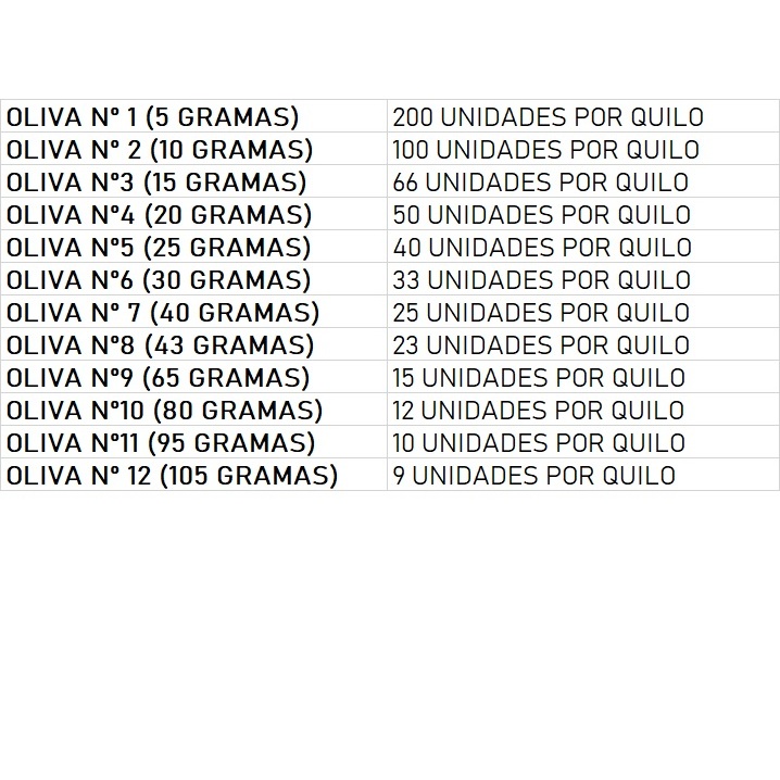 Chegará até você 1 kg de Chumbadas Oliva, basta apenas você escolher o tamanho desejado. A Chumbada Oliva para Pesca LOBO é ideal para pesca de praia, rio, lagos, açudes pesqueiros, canal e outros. O modelo Oliva é um dos mais comuns e pode ser usado solto na linha permitindo que a linha fique ancorada, porém deixa o peixe carregar a isca até que seja fisgado. São boas para todos os tipos de pescas de fundo. O peso da chumbada a ser utilizada irá depender das condições do local, por isso é sempre interessante levar alguns exemplares com pesos diferentes. Especificações Técnicas: – Tamanhos: de Arrozinho 1 à 12 – Pesos Unitários: de 5gs à 115gs – Fabricante: LOBO – Finalidade: Pesca / Outros Chumbadas Oliva , disponíveis nos seguintes tamanhos: OLIVA Nº 1 - Peso: 5 gramas OLIVA Nº 2 - Peso: 10 gramas OLIVA Nº 3 - Peso: 15 gramas OLIVA Nº 4 - Peso: 20 gramas OLIVA Nº 5 - Peso: 25 gramas OLIVA Nº 6 - Peso: 30 gramas OLIVA Nº 7 - Peso: 40 gramas OLIVA Nº 8 - Peso: 43 gramas OLIVA Nº 9 - Peso: 65 gramas OLIVA Nº 10 - Peso: 80 gramas OLIVA Nº 11 - Peso: 95 gramas OLIVA Nº 12 - Peso: 115 gramas Cliente, qualquer duvida nos envie através do chat que atenderemos prontamente.