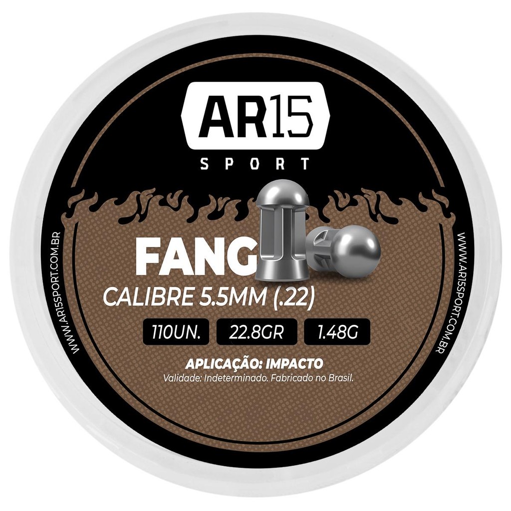 ESPECIFICAÇÕES TÉCNICAS: - Marca: Ar15 Sport - Modelo: FANG - Calibre: 5.5mm (.22) - Quantidade: 110 unidades - Peso: 1.48 gramas - Gramatura: 22.8 grains - Material: Chumbo - Aplicação: Impacto - Comprimento: 9,8mm - Peso bruto total caixa: 181 gramas ITENS INCLUSOS: - 02 Chumbinho Ar15 Sport FANG 5.5mm 110un. Observação: Garantia de 03 meses mediante defeitos de fábrica.