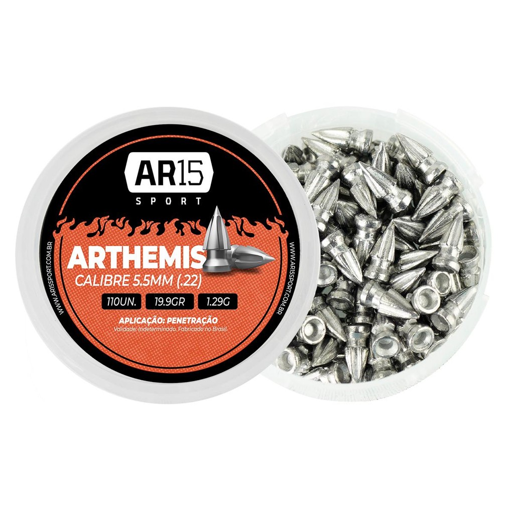 ESPECIFICAÇÕES TÉCNICAS: - Marca: Ar15 Sport - Modelo: ARTHEMIS - Calibre: 5.5mm (.22) - Quantidade: 110 unidades - Peso: 1.29 gramas - Gramatura: 19.9 grains - Material: Chumbo - Aplicação: Impacto - Comprimento: 12,3mm - Peso bruto total caixa: 157 gramas ITENS INCLUSOS: - 01 Chumbinho Ar15 Sport ARTHEMIS 5.5mm 110un. Observação: Garantia de 03 meses mediante defeitos de fábrica.