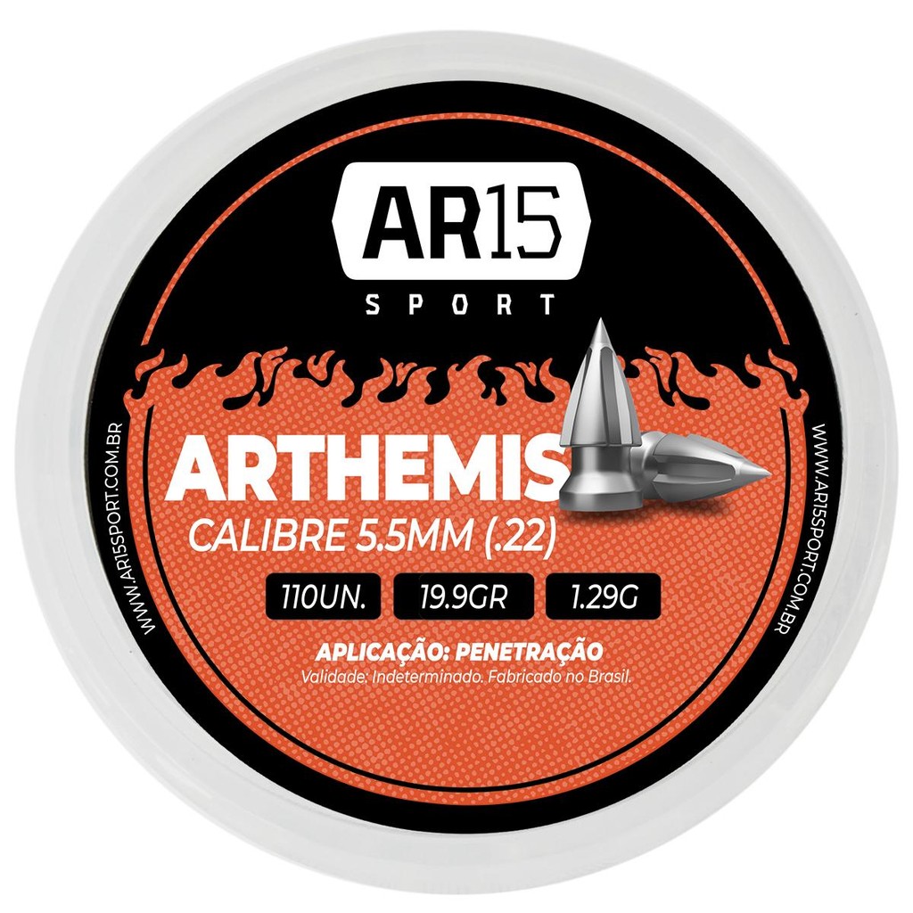 ESPECIFICAÇÕES TÉCNICAS: - Marca: Ar15 Sport - Modelo: ARTHEMIS - Calibre: 5.5mm (.22) - Quantidade: 110 unidades - Peso: 1.29 gramas - Gramatura: 19.9 grains - Material: Chumbo - Aplicação: Impacto - Comprimento: 12,3mm - Peso bruto total caixa: 157 gramas ITENS INCLUSOS: - 02 Chumbinho Ar15 Sport ARTHEMIS 5.5mm 110un. Observação: Garantia de 03 meses mediante defeitos de fábrica.
