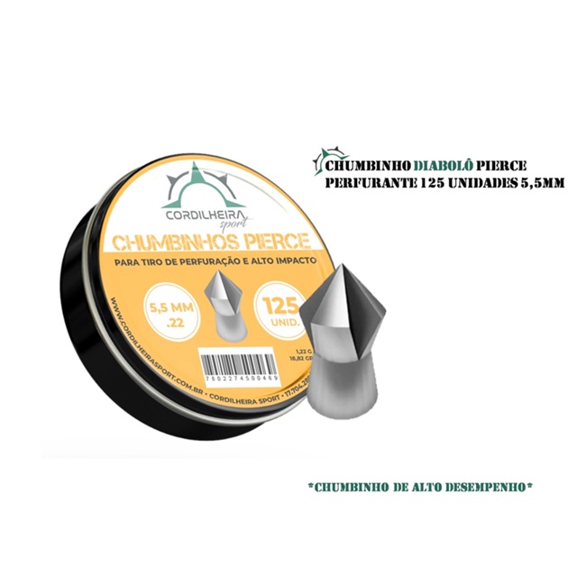 | Chumbinho Cordilheira Pierce Perfurante 5,5mm | 125 Unidades este produto | R$ 21,00 | — | 4.9/5 | 1 |