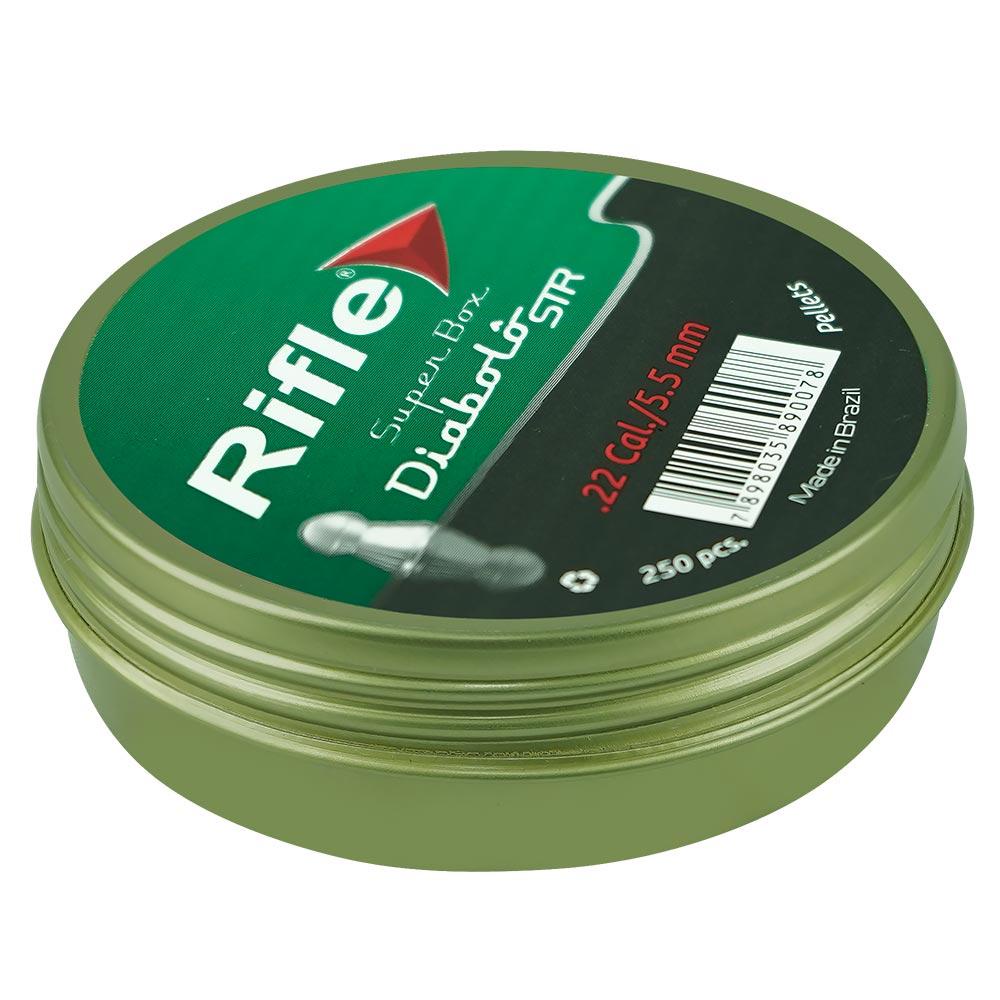 Produto de uso exclusivo em práticas esportivas. O uso do produto exige treinamento e equilíbrio emocional. Deverá ser guardado em lugar seguro e fora do alcance de terceiros. Os produtos aqui listados servem apenas para uso recreativo, ou seja ***NÃO*** letal. A marca RIFLE é uma empresa que há 30 anos fabrica as melhores munições para Armas de Pressão e Ar comprimido do Brasil. Reconhecida por produzir Chumbos que estão entre os quatro melhores do mundo, usados também por atletas olímpicos e campeões mundiais, aprovados pelas melhores fabricantes de armas do mundo. Símbolo de qualidade e excelência. O Chumbinho da Linha DIABOLÔ STR da Rifle já é tradicional e oferece lazer com qualidade e baixo custo. Esse modelo possui ligas de chumbo e antimônio com composição refinada e controlada por espectrometria. Indicado para tiros à lazer ele é a opção perfeita para atiradores amadores e até mesmo profissionais. Escolher uma munição de qualidade é essencial para seu desempenho na prática do Tiro Esportivo. Atendendo o alto padrão de qualidade esse Chumbinho da Rifle não possui rebarbas, opção perfeita para sua Arma de Pressão. Especificações Técnicas: - Marca: Rifle - Calibre: 5.5mm (.22) - Modelo: STR - Linha: Diabolô - Versão: Super Box - Material: Chumbo - Quantidade: 250 unidades - Gramatura não especificada - Comprimento: 7,1mm Itens Inclusos: - 01 Lata de Chumbinho Rifle Diabolô STR 250un. 5.5mm INFORMAÇÃO: Os equipamentos, peças e acessórios aqui listados são de uso exclusivo em armas de pressão (gás comprimido ou mola), airsoft, paintball, esferas plásticas (BBS) e estão em conformidade com a legislação brasileira de USO PERMITIDO "É permitido o uso de armas de pressão por ação de gás comprimido ou por ação de mola, com calibre igual ou inferior a seis milímetros (6mm ou 6.0mm), e das que lançam esferas de plástico com tinta, como os lançadores de paintball." Conforme parágrafo único do Art. 11 do DECRETO Nº 11.615, DE 21 DE JULHO DE 2023. A venda desses itens é feita somente para maiores de 18 anos mediante a comprovação de maior idade. Atenção: O envio de Armas de pressão e Airsoft é realizado somente por transportadora. Caso tenham dúvidas entrar em contato.