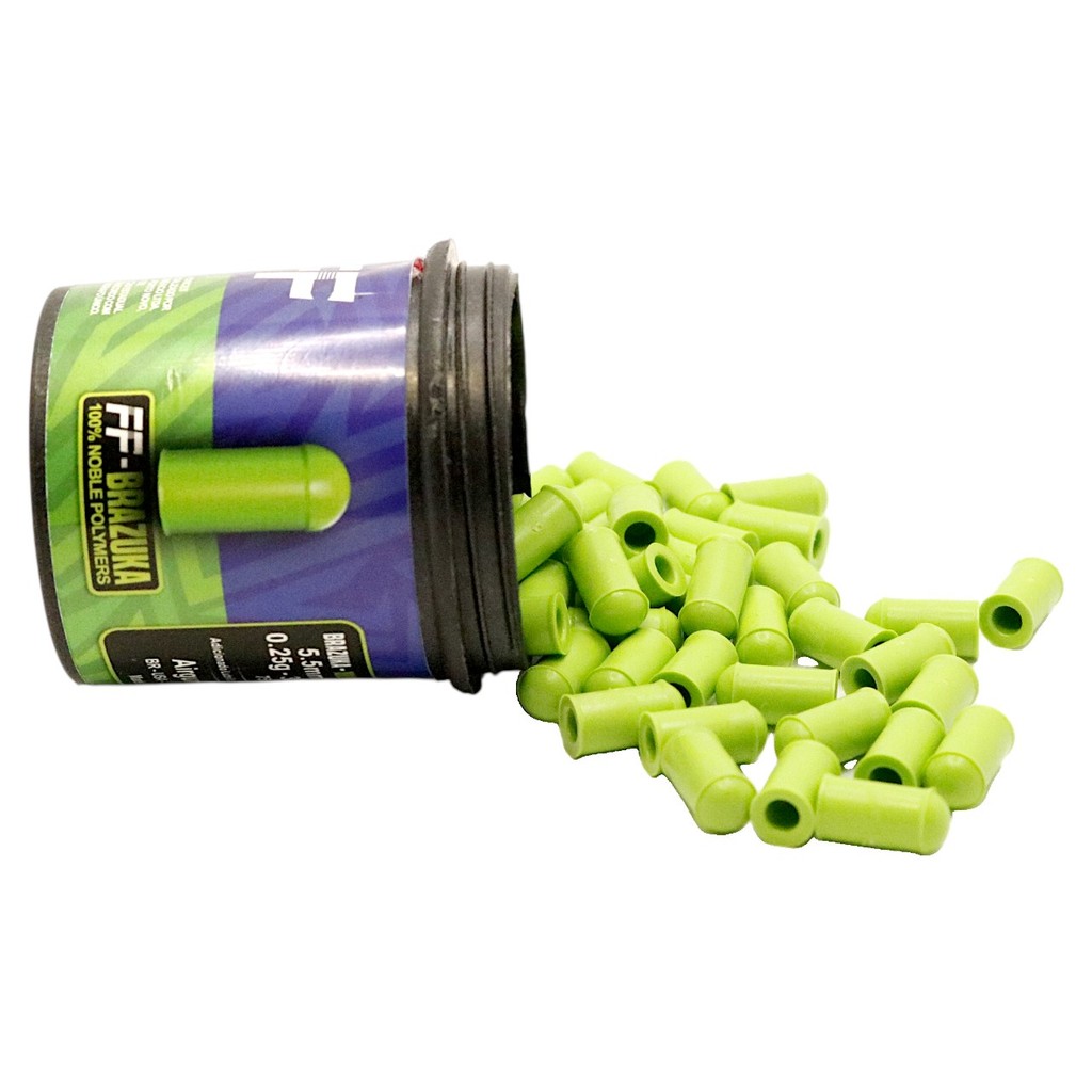 Chumbinho FF Brazuka 5.5mm com 75 Unidades Alta Velocidade e Precisão com 100% Polímero Nobre, Isento de Metais O Chumbinho FF Brazuka 5.5mm é uma opção inovadora para quem busca tiros rápidos, precisos e sustentáveis. Fabricado pela Fire Feldman (FF) com 100% polímero nobre e totalmente livre de metais, esse modelo é ideal para tiro esportivo, prática recreativa e treinos técnicos com carabinas ou pistolas de pressão no calibre 5.5mm. Seu formato esférico (Ball) e saia lisa garantem estabilidade em voo, menor atrito e agrupamento eficiente, mesmo em disparos de média distância. Com baixíssimo peso, atinge velocidades impressionantes em armas PCP, Gás Ram ou Mola, oferecendo um desempenho acima da média em sua categoria. Por que escolher o Chumbinho FF Brazuka? Alta velocidade com impacto preciso e trajetória estável 100% livre de metais, mais leve, seguro e ecológico Ideal para treinos e práticas recreativas, com baixo desgaste no cano Desempenho excepcional em carabinas PCP, Gás Ram ou Mola Fabricado no Brasil com padrão avançado de qualidade Características Marca: FF - Fire Feldman Modelo: Brazuka Calibre: 5.5mm (.22) Peso unitário: 0,25 g / 3,85 grains Material: 100% polímero nobre (sem metais) Tipo de ponta: Esférica (Ball) Tipo de saia: Lisa Cor: Verde Indicação de uso: Tiro esportivo, tiro ao alvo, prática recreativa Compatibilidade: Carabinas e pistolas de pressão calibre 5.5mm Velocidade média: Até 350 m/s em carabinas de mola ou gás ram Até 570 m/s em carabinas PCP Conteúdo da embalagem: 75 chumbinhos Atenção Venda permitida apenas para maiores de 18 anos. Nunca atire em superfícies duras (pedras, paredes de alvenaria ou chapas de aço), pois há risco de ricochete. Utilize sempre em um ambiente seguro e com óculos de proteção. Posicione os alvos com um fundo seguro, como barrancos de terra ou chapas de EVA, para evitar transfixação. Mantenha fora do alcance de crianças e animais e utilize com responsabilidade. Garantia 3 meses contra defeitos de fabricação Itens Inclusos 1x Pote de chumbinho brazuka 5.5mm (75un) 1x Nota Fiscal Imagens meramente ilustrativas. As cores e detalhes podem variar conforme sua tela e o produto final.