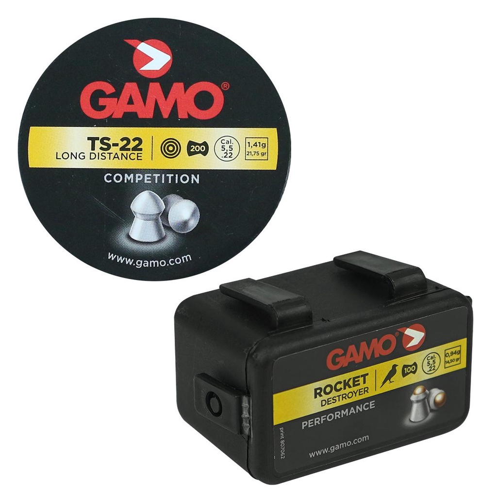 Produto de uso exclusivo em práticas esportivas. O uso do produto exige treinamento e equilíbrio emocional. Deverá ser guardado em lugar seguro e fora do alcance de terceiros. Os produtos aqui listados servem apenas para uso recreativo, ou seja ***NÃO*** letal. A GAMO é uma fabricante ESPANHOLA com sede em Barcelona, Espanha e se caracteriza por ser uma das maiores produtoras desse segmento. A empresa foi fundada em 1959, como El Gamo e hoje é um símbolo de excelência no Brasil. Reconhecida também por produzir MUNIÇÕES de excelente qualidade, a Gamo produz Chumbinhos que proporcionam alto desempenho para sua Arma de pressão. ESPECIFICAÇÕES TÉCNICAS DO ROCKET: - Marca: Gamo - Calibre: 5.5mm (.22) - Modelo: Rocket - Aplicação: Destroyer - Quantidade: 100 unidades - Peso: 0,94 gramas - Gramatura: 14,50 grains - Comprimento: 8,4mm - Dimensões da embalagem: 42,5mm x 34,6mm x 61,4mm ESPECIFICAÇÕES TÉCNICAS DO TS-22: - Marca: Gamo - Calibre: 5.5mm (.22) - Modelo: TS-22 Long Distance Competition - Quantidade: 200 unidades - Peso e gramatura: 1,41g 21,75gr - Comprimento: 7,8mm ITENS INCLUSOS: - 01 Lata de Chumbinho Gamo TS-22 Long Distance Competition 200un. 5.5mm - 01 Caixa de Chumbinho Gamo Rocket Destroyer 5.5mm 100un. INFORMAÇÃO: Os equipamentos, peças e acessórios aqui listados são de uso exclusivo em armas de pressão (gás comprimido ou mola), airsoft, paintball, esferas plásticas (BBS) e estão em conformidade com a legislação brasileira de USO PERMITIDO "É permitido o uso de armas de pressão por ação de gás comprimido ou por ação de mola, com calibre igual ou inferior a seis milímetros (6mm ou 6.0mm), e das que lançam esferas de plástico com tinta, como os lançadores de paintball." Conforme parágrafo único do Art. 11 do DECRETO Nº 11.615, DE 21 DE JULHO DE 2023. A venda desses itens é feita somente para maiores de 18 anos mediante a comprovação de maior idade. Atenção: O envio de Armas de pressão e Airsoft é realizado somente por transportadora. Caso tenham dúvidas entrar em contato.