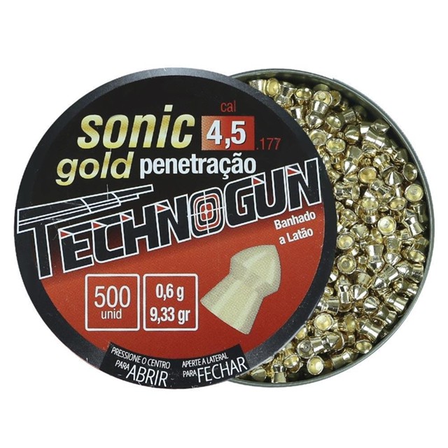 Produto de uso exclusivo em práticas esportivas. O uso do produto exige treinamento e equilíbrio emocional. Deverá ser guardado em lugar seguro e fora do alcance de terceiros. Os produtos aqui listados servem apenas para uso recreativo, ou seja ***NÃO*** letal. A TECHNOGUN é uma marca já muito famosa no mundo do Tiro Esportivo, reconhecida por ser uma das maiores fabricantes de munição no Brasil. Seus chumbinhos são formados por um exclusivo sistema de injeção em alta pressão, permitindo um balanceamento centrífugo gerando mais uniformidade e precisão. Outra informação importante é que a liga utilizada pela marca nos projéteis é formada predominantemente por chumbo(98%), zinco e outros metais! Oferecendo a dureza necessária para atender as mais exigentes armas nacionais e importadas. O Chumbinho Technogun modelo Sonic Gold Penetração faz jus ao seu título e é caracterizado pelo grande poder de penetração. Totalmente revestido por um micro banho de latão, que diminui consideravelmente o coeficiente de atrito dentro do cano da arma, transferindo ao chumbinho mais energia e potência. Esse modelo é indicado exclusivamente para Armas de média e alta pressão, com tiros a longa distância. Especificações Técnicas: - Marca: Technogun - Calibre: 4.5mm (.177) - Modelo: Sonic Gold Penetração - Material: Chumbo banhado a latão - Quantidade: 500 unidades - Peso: 0,6 gramas - Gramatura: 9,33 grains - Comprimento: 6,7mm Itens Inclusos: - 01 Lata de Chumbinho Technogun Sonic Gold Penetração 9,33gr 500un. Calibre 4.5mm INFORMAÇÃO: Os equipamentos, peças e acessórios aqui listados são de uso exclusivo em armas de pressão (gás comprimido ou mola), airsoft, paintball, esferas plásticas (BBS) e estão em conformidade com a legislação brasileira de USO PERMITIDO "É permitido o uso de armas de pressão por ação de gás comprimido ou por ação de mola, com calibre igual ou inferior a seis milímetros (6mm ou 6.0mm), e das que lançam esferas de plástico com tinta, como os lançadores de paintball." Conforme parágrafo único do Art. 11 do DECRETO Nº 11.615, DE 21 DE JULHO DE 2023. A venda desses itens é feita somente para maiores de 18 anos mediante a comprovação de maior idade. Atenção: O envio de Armas de pressão e Airsoft é realizado somente por transportadora. Caso tenham dúvidas entrar em contato.