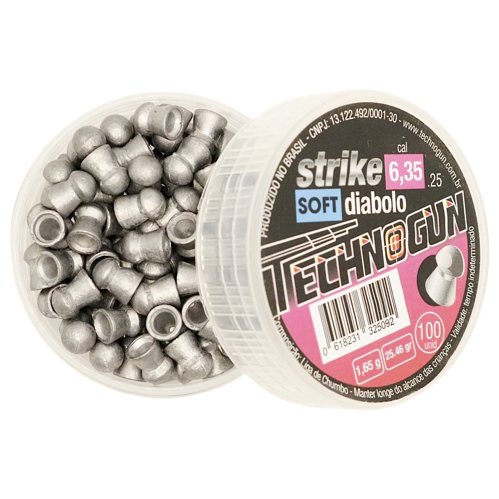 Chumbinho Technogun Strike Diabolo Soft 6,35 mm com 100 Unidades Disparos com Alta Precisão e Consistência O Chumbinho Technogun Strike Diabolo Soft 6,35 mm (.25) foi projetado para atiradores que exigem precisão, agrupamento consistente e transferência de energia controlada. Produzido com controle dimensional rigoroso e material de alta qualidade, o Diabolo Soft oferece desempenho estável em carabinas e pistolas de ar comprimido calibre 6,35 mm. Por que escolher o Chumbinho Strike Diabolo Soft 6,35 mm? Precisão excepcional: geometria Diabolo otimizada para trajetórias estáveis e agrupamentos consistentes. Peso balanceado: 1,65 g ( 25,46 grãos) equilíbrio entre estabilidade e velocidade para melhor controle do impacto. Alta consistência: controle de qualidade que reduz variações entre unidades, garantindo desempenho previsível tiro a tiro. Efeito terminal controlado: desenho de expansão/soft que melhora a transferência de energia em alvos apropriados. Custo-benefício: embalagem com 100 unidades, ideal para longas sessões de treino e competições. Compatibilidade ampla: indicado para carabinas e pistolas de ar comprimido calibre 6,35 mm (.25). Garanta já os seus Chumbinhos Strike Diabolô Soft aqui na Falcon Armas! Mais de 26 anos de experiência, pagamento seguro e envio para todo o Brasil. Características Marca: Technogun Modelo: Strike Diabolo Soft Calibre: 6,35 mm (.25) Tipo: Diabolo Soft / Expansão Tipo de Saia: Lisa Tipo da Ponta: Domed Peso unitário: 1,65 g (25,46 grãos) Quantidade por embalagem: 100 unidades Uso recomendado: Treino, competição, prática de tiro e aplicações que exijam precisão e efeito terminal controlado. Atenção Nunca atire em superfícies duras (pedras, paredes de alvenaria ou chapas de aço), pois há risco de ricochete. Utilize sempre em um ambiente seguro e com óculos de proteção. Posicione os alvos com um fundo seguro, como barrancos de terra ou chapas de EVA, para evitar transfixação. Mantenha fora do alcance de crianças e animais e utilize com responsabilidade. Garantia 3 meses contra defeitos de fabricação Itens Inclusos 100x Chumbinhos Strike Diabolô Soft 6,35mm Technogun 1x Nota Fiscal Imagens meramente ilustrativas. As cores e detalhes podem variar de acordo com sua tela e o produto final.