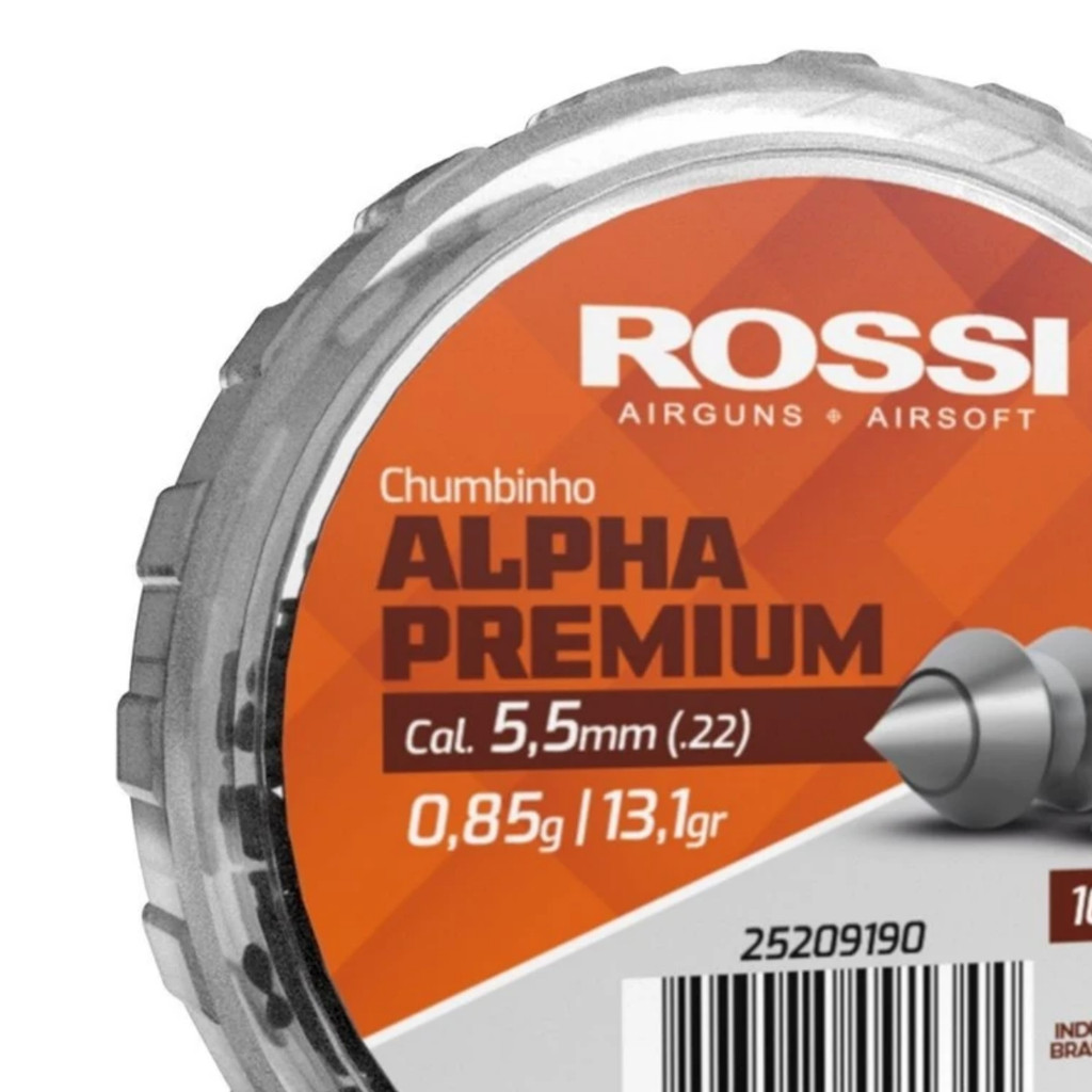 Chumbo Rossi Alpha Premium 5,5mm Pontiagudo — 100un Alpha Premium pontiagudo: desempenho para média e longa distância com boa penetração e agrupamento; embalagem em lata resistente com 100 unidades — ideal para treino e uso em alvos mais rígidos. Características: - Marca: Rossi - Modelo: Alpha Premium - Calibre: 5,5 mm (.22) - Tipo: pontiagudo - Peso unitário: 0,85 g (13,11 grains) - Quantidade: 100 unidades (lata metálica) - Material: liga de chumbo - Aplicação: penetração, precisão, tiro esportivo e alvos rígidos - Peso total da embalagem: 110 g - Código do produto: 25209190 - Embalagem: lata resistente com vedação protetora - Lubrificação e inspeção de qualidade conforme fabricante - As imagens são meramente ilustrativas - O uso do produto exige treinamento e equilíbrio emocional. - Deverá ser guardado em lugar seguro e fora do alcance de terceiros. Itens Inclusos: - 1x Lata com 100 chumbinhos Rossi Alpha Premium 5,5mm - 1x nota fiscal